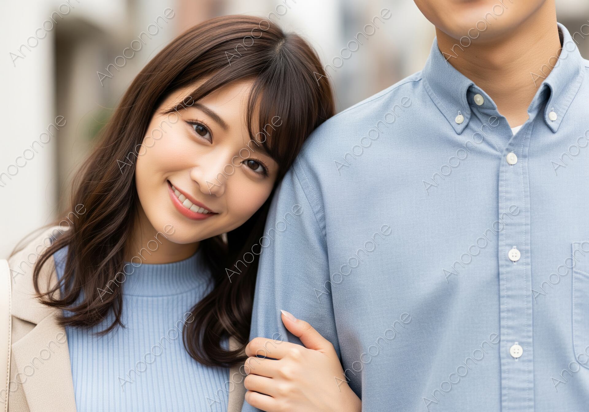 画像素材:屋外の明るい場所で、青いシャツを着た男性の肩にそっと頭を寄せ、カメラに向かって愛らしく微笑む女性のポートレートです。淡いブルーのトップスとベージュのコートの組み合わせが、優しく爽やかな印象を与えています。男性の肩に置かれた手と、幸せそうな表情が、二人の強い信頼感と愛情を伝えています。この画像は、ライフスタイル、恋愛、結婚、または安心感や絆をテーマにしたコンテンツ制作に最適です。