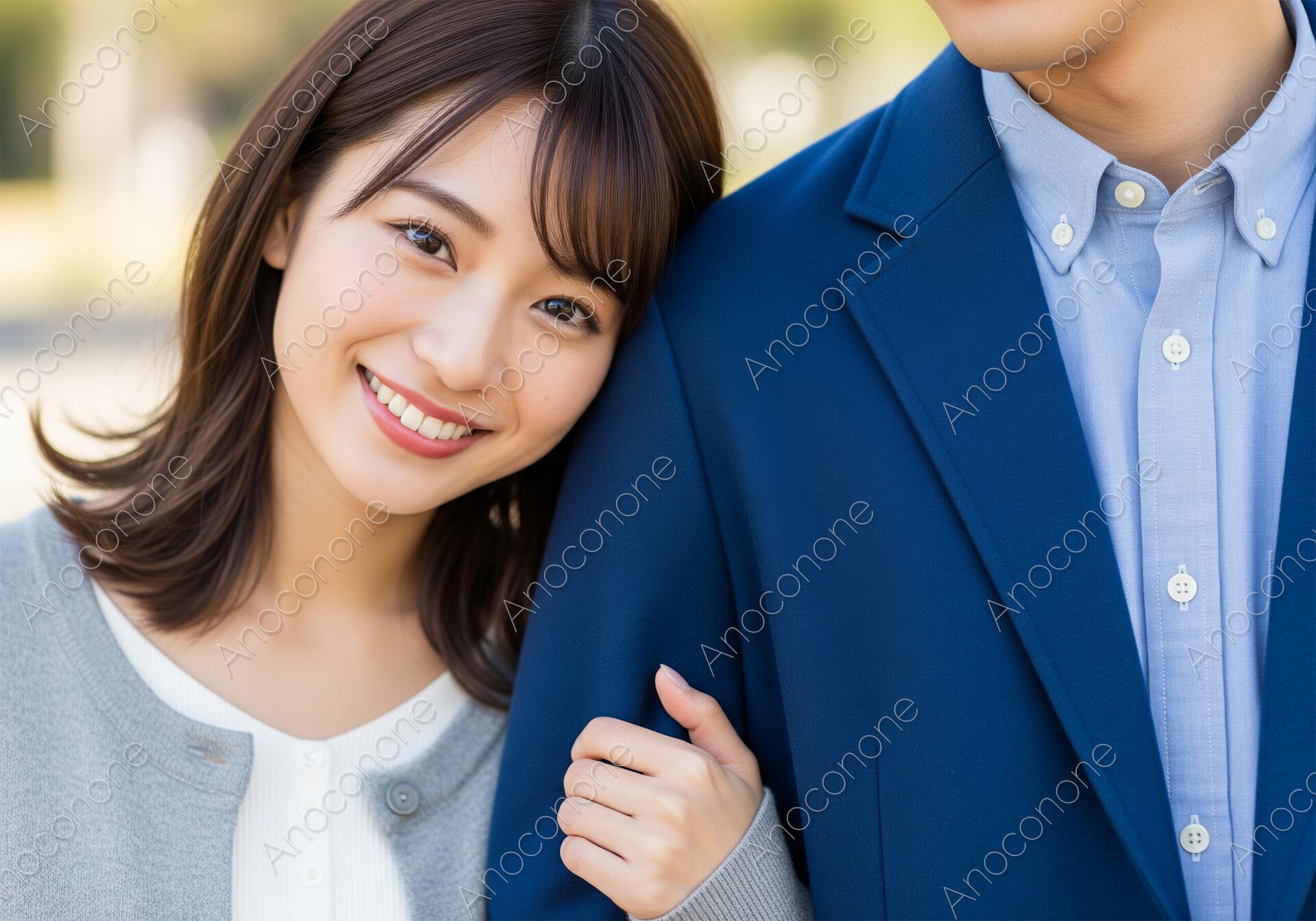 画像素材:屋外の明るい場所で、青いジャケットの男性の腕に優しく頭を乗せ、カメラに向かって微笑む女性のクローズアップポートレートです。グレーのカーディガンと白のインナーが清楚で上品な印象を与えています。男性のジャケットの色と、女性の穏やかな表情が調和し、二人の間の強い愛情と安定した関係性が伝わってくる一枚です。この画像は、結婚、家族計画、保険、または落ち着いたライフスタイルをテーマにした広告やウェブコンテンツに最適です。