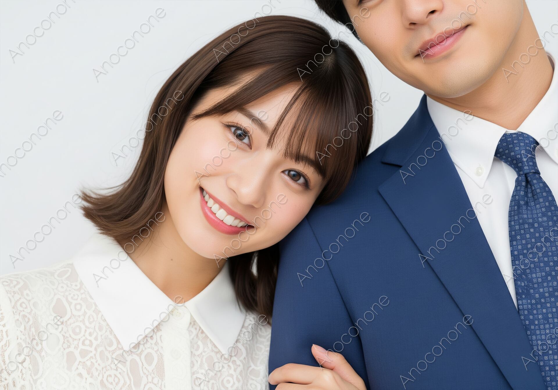 画像素材:クリーンな白背景の前で、濃紺のスーツ姿の男性の肩に頭を寄せ、優しく微笑む女性のクローズアップポートレートです。女性は白いレースのブラウスを着用し、清潔感と上品さを強調しています。男性のネクタイと女性の清楚な服装が、ビジネスライクでありながらも強い愛情と信頼関係を表現しています。この画像は、金融、保険、不動産、または結婚相談所など、信頼性と安心感を訴求したい企業のブランディングや広告に最適です。