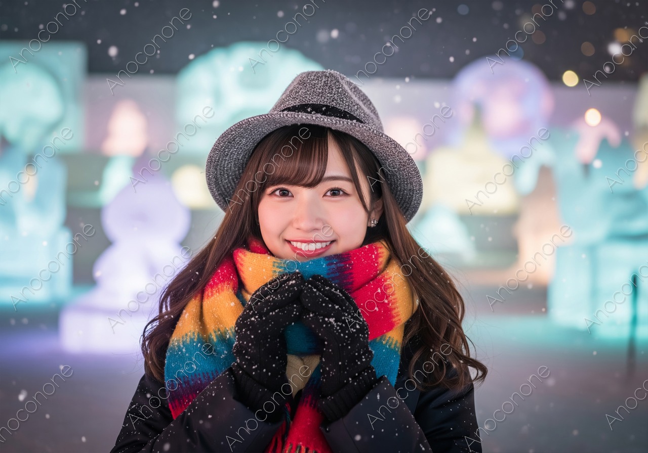 画像素材:雪が舞い散る冬の夜の屋外イベント会場で、ハットと鮮やかな配色のマフラーを身に着けた若い女性のポートレートです。カラフルな光を放つ雪像を背景に、カメラに向かって明るい笑顔を見せています。黒いグローブをはめた手を胸元で組み、寒さの中でもイベントを楽しむポジティブな雰囲気が伝わってきます。冬の旅行、イベント、ライフスタイルなどのテーマにぴったりの、魅力的なストック画像素材です。