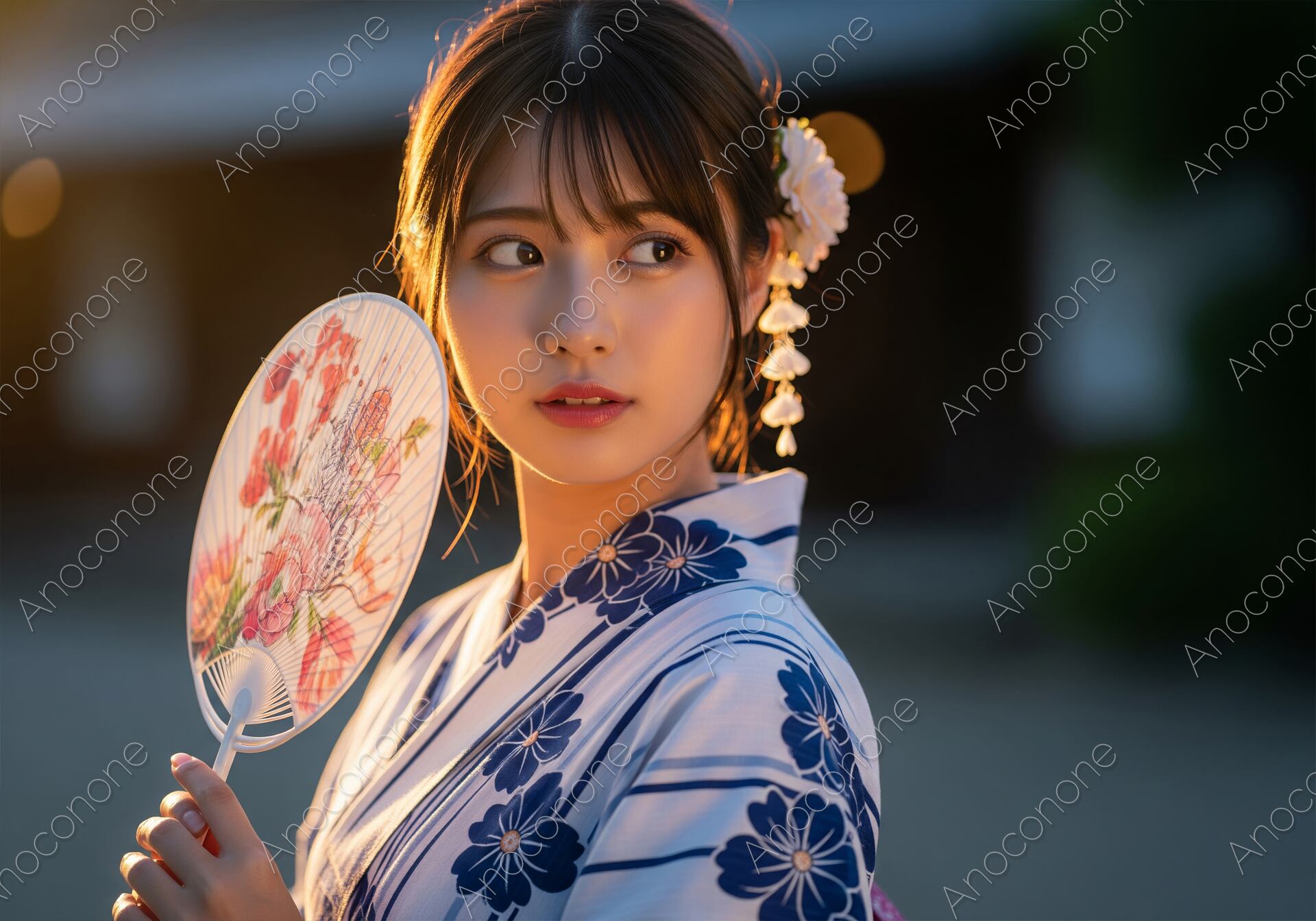 画像素材:夏の夕暮れ時、柔らかな自然光に照らされた若い女性のポートレートです。紺と白の古典的な柄の浴衣を着用し、白い花飾りを髪に付け、花柄の団扇を優雅に持つ姿が印象的です。団扇で顔を少し隠し、斜め横に視線を送る艶やかな表情が、夏の夕方の風情と相まって美しさを引き立てています。お祭り、花火大会、夏の旅行、和のライフスタイルなど、季節感のあるビジュアルが必要な媒体に最適な素材です。