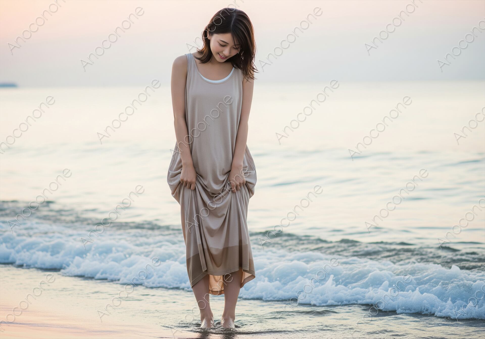 画像素材:穏やかな波が打ち寄せる夕暮れ時の砂浜で、ベージュのロングワンピースを着用した若い女性の全身ポートレートです。女性は少し俯いて微笑みながら、優しくワンピースの裾を持ち上げており、足元を洗う波を楽しむ様子が伝わってきます。夕焼け前の淡い光と、水面や砂浜の柔らかな色合いが相まって、非常にロマンチックで癒やされる雰囲気を醸し出しています。夏の旅行、リゾート、美容、ライフスタイルなどの分野で、優しく穏やかなイメージを伝えるビジュアルとして最適です。