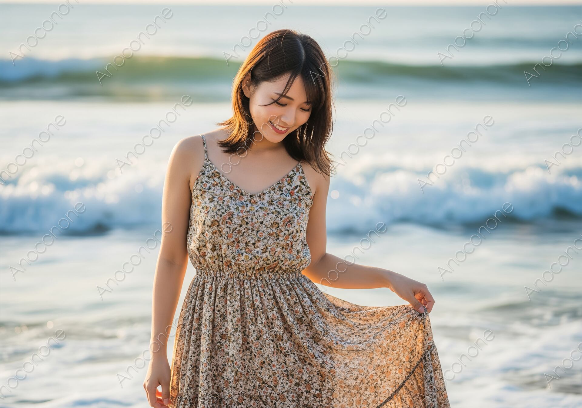 画像素材:穏やかな夏の日の波打ち際で、花柄のキャミソールワンピースを着用した若い女性の全身ポートレートです。女性は優しくほほ笑みながら、ワンピースの裾を軽く持ち上げ、光を浴びた水面と波を背景に、自然なポーズをとっています。全体的に明るい日差しが注ぎ、夏の解放感とバカンスの楽しい雰囲気が伝わってきます。リゾート、旅行、ファッション、美容、夏のキャンペーンなど、ポジティブなイメージを求める媒体に最適です。