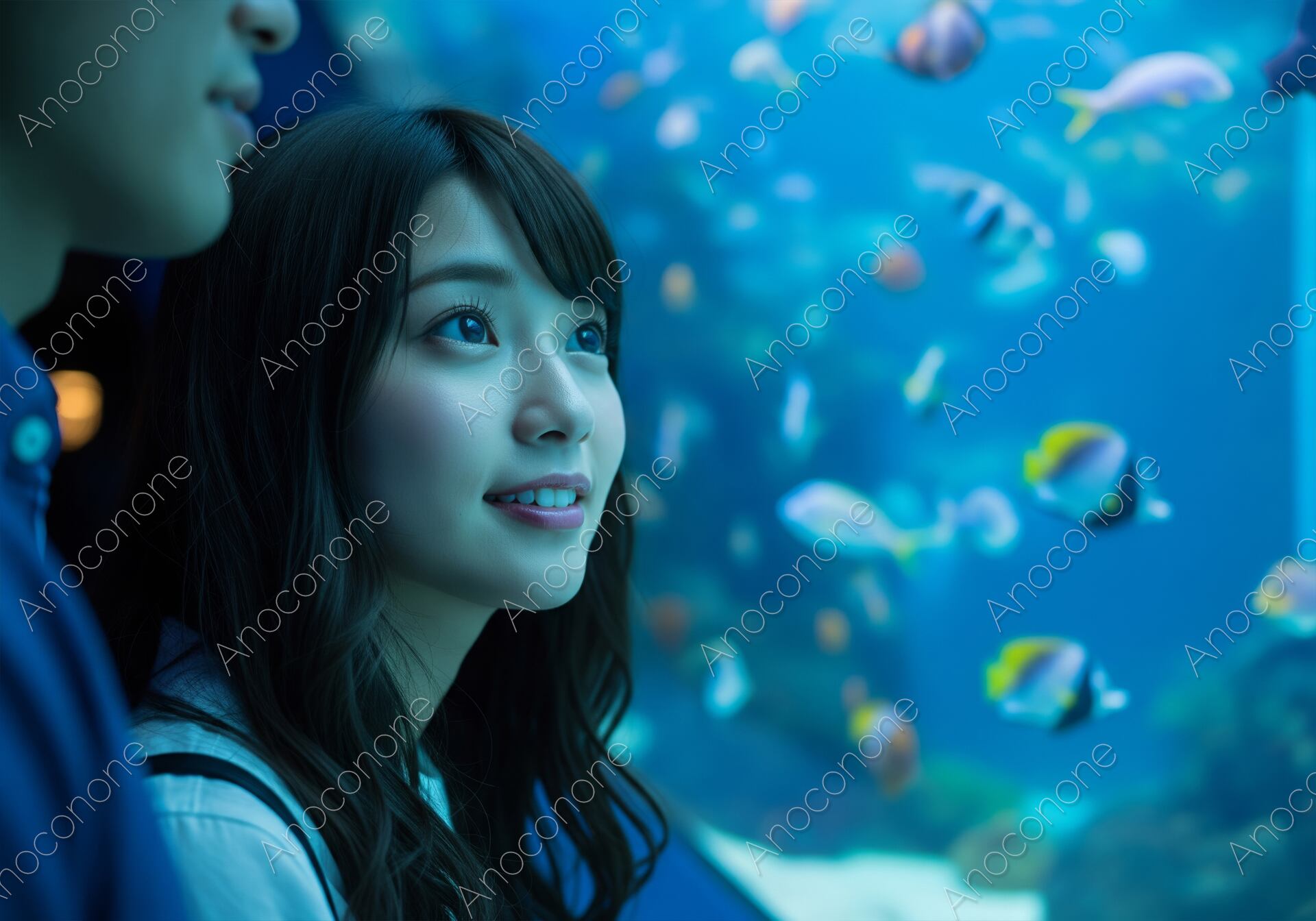 画像素材:水族館の大型水槽を間近で鑑賞している、若い女性のクローズアップポートレートです。水槽から放たれる青い光が女性の顔を幻想的に照らし出し、目を輝かせながら微笑む表情は、水中の生き物たちに魅了されている様子を伝えています。女性の横顔の一部に男性の姿が映り込み、デートや友人とのレジャーの場面を示唆しています。旅行、レジャー、癒やし、ライフスタイルなど、明るく穏やかなイメージを表現したい媒体に最適な素材です。