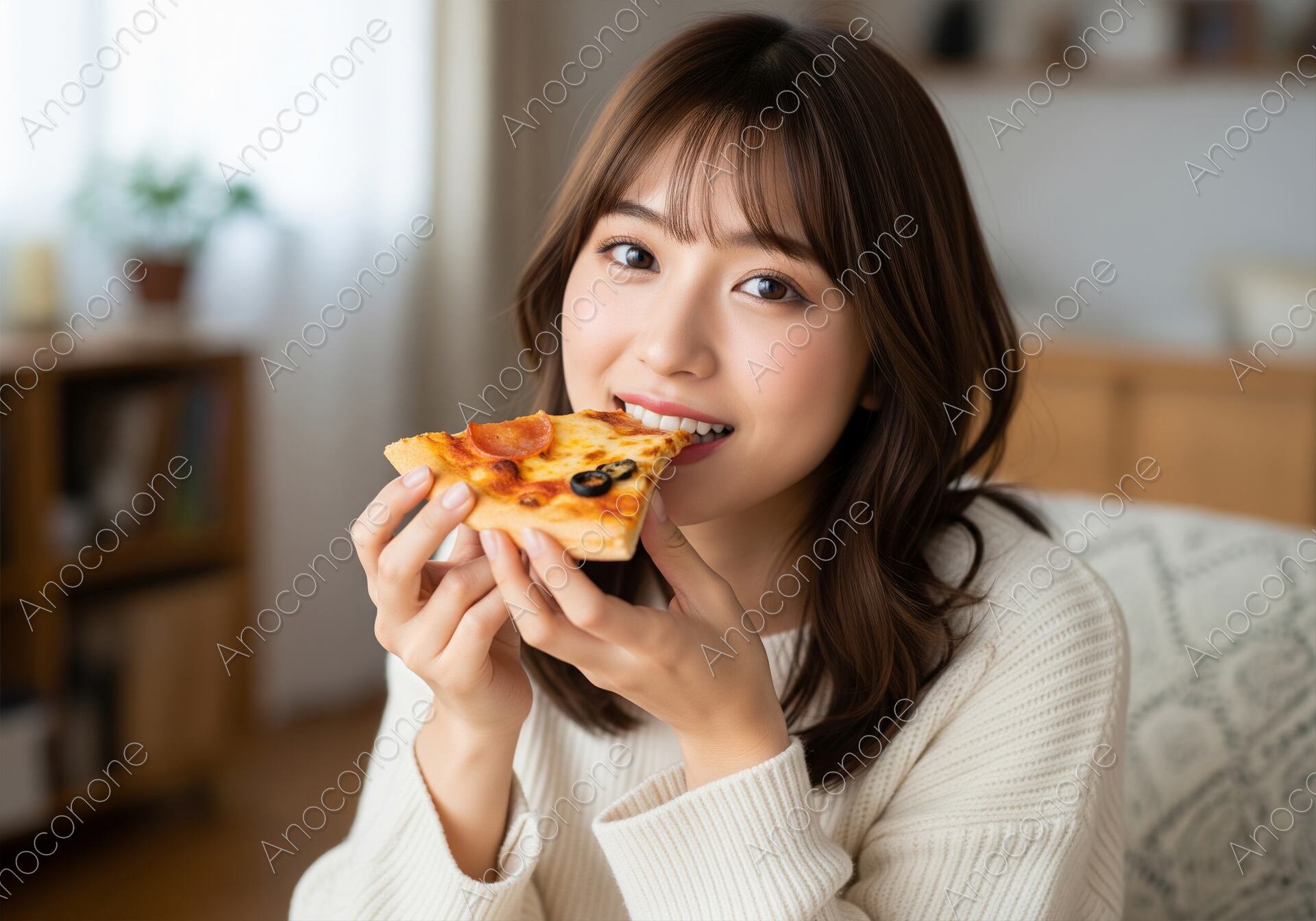 画像素材:自宅のリビングルームの明るい室内で、ニットのセーターを着た若い女性が、一切れのピザを口に運び、カメラに向かって楽しそうな笑顔を見せているクローズアップポートレートです。ピザにはサラミとオリーブがトッピングされており、美味しそうな熱気が伝わってきます。カジュアルな食事のシーン、デリバリーサービス、友人とのパーティー、インドアでのリラックスした時間など、ポジティブで親しみやすいイメージのビジュアルに最適な素材です。