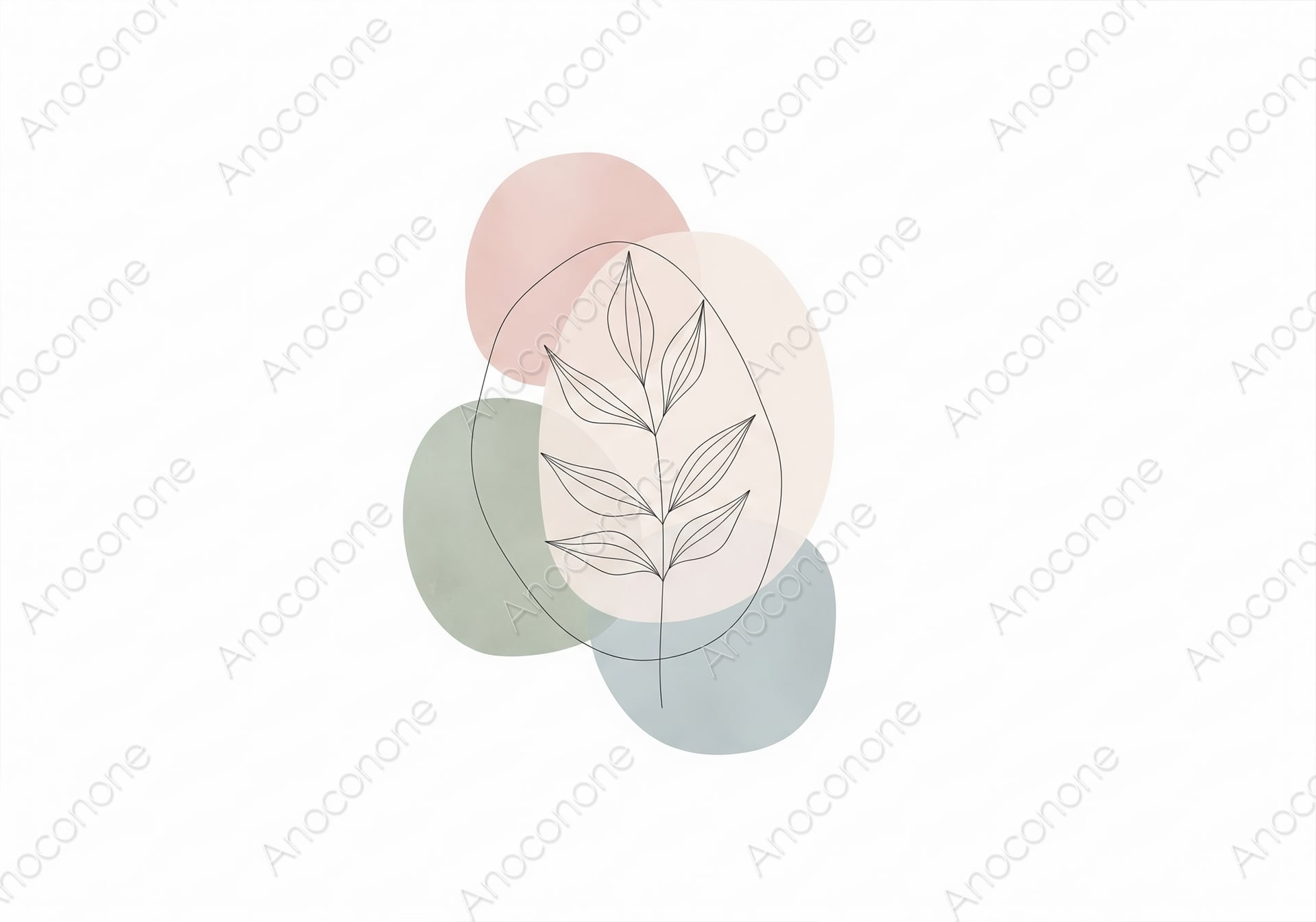 画像素材:白地の背景に、ダスティピンク、セージグリーン、くすんだブルーなど、ニュアンスのあるパステルカラーの抽象的な楕円形の色面を重ねたデザインです。その上に、一本の植物の枝葉をモチーフにした黒のシンプルな線画(ワイヤーアート風)が配置されています。ミニマルかつモダンな印象で、ウェブサイトの背景、製品パッケージ、ポスター、ソーシャルメディアのビジュアル、ウェディング関連のデザインなど、落ち着いたトーンで洗練された雰囲気を演出したい用途に最適です。