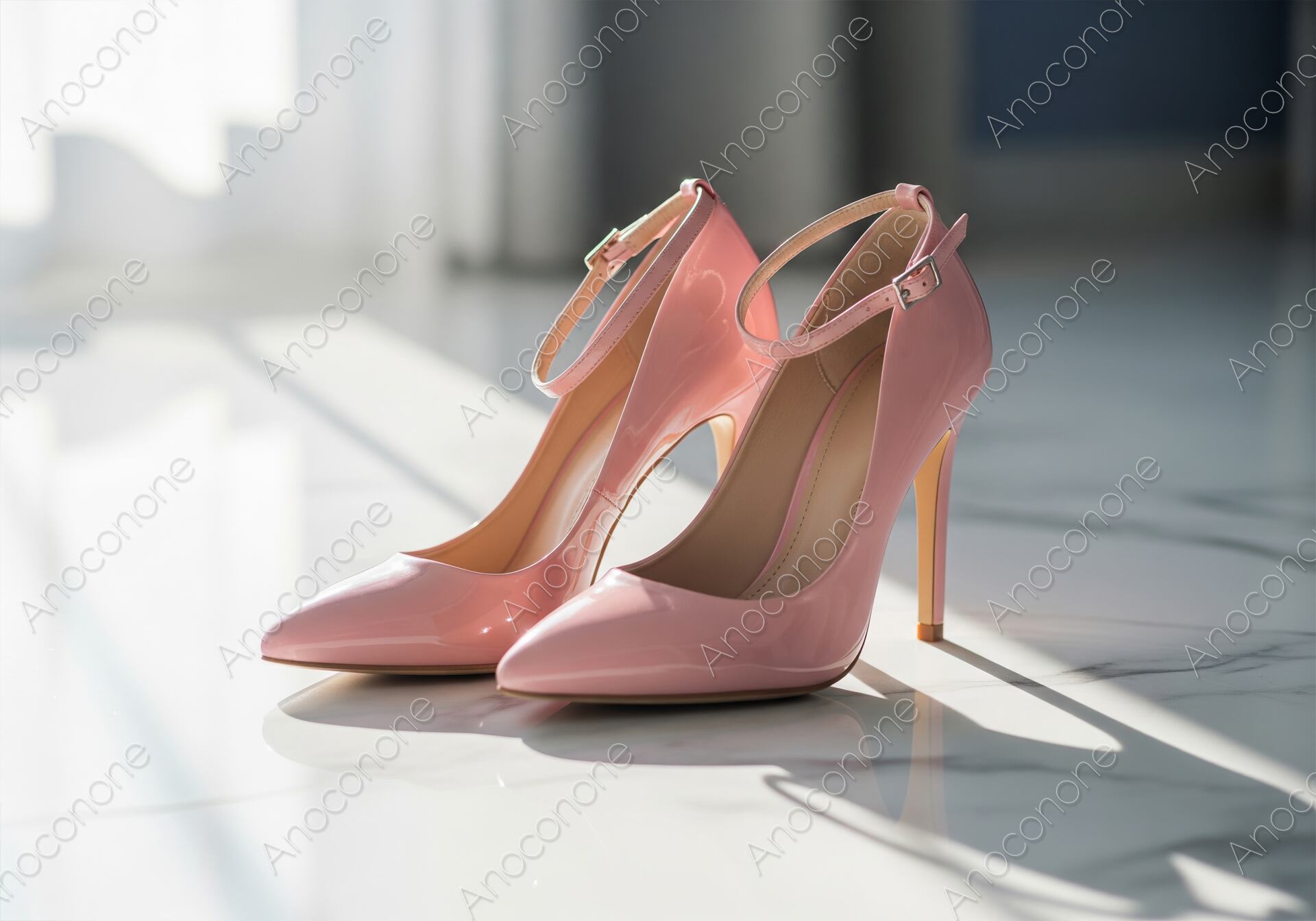 画像素材:白い大理石のような床の上に置かれた、光沢のあるパテントレザー(エナメル素材)の鮮やかなピンク色のハイヒールパンプスのクローズアップ写真です。ハイヒールには、足首を固定する華奢なアンクルストラップが付いています。窓から差し込む強い自然光が床に幾何学的な影を落とし、靴の表面を美しく輝かせ、ロマンチックでエレガントな雰囲気を強調しています。ファッション、パーティー、ブライダル、フェミニンなアイテム、靴のECサイトなどに最適な素材です。
