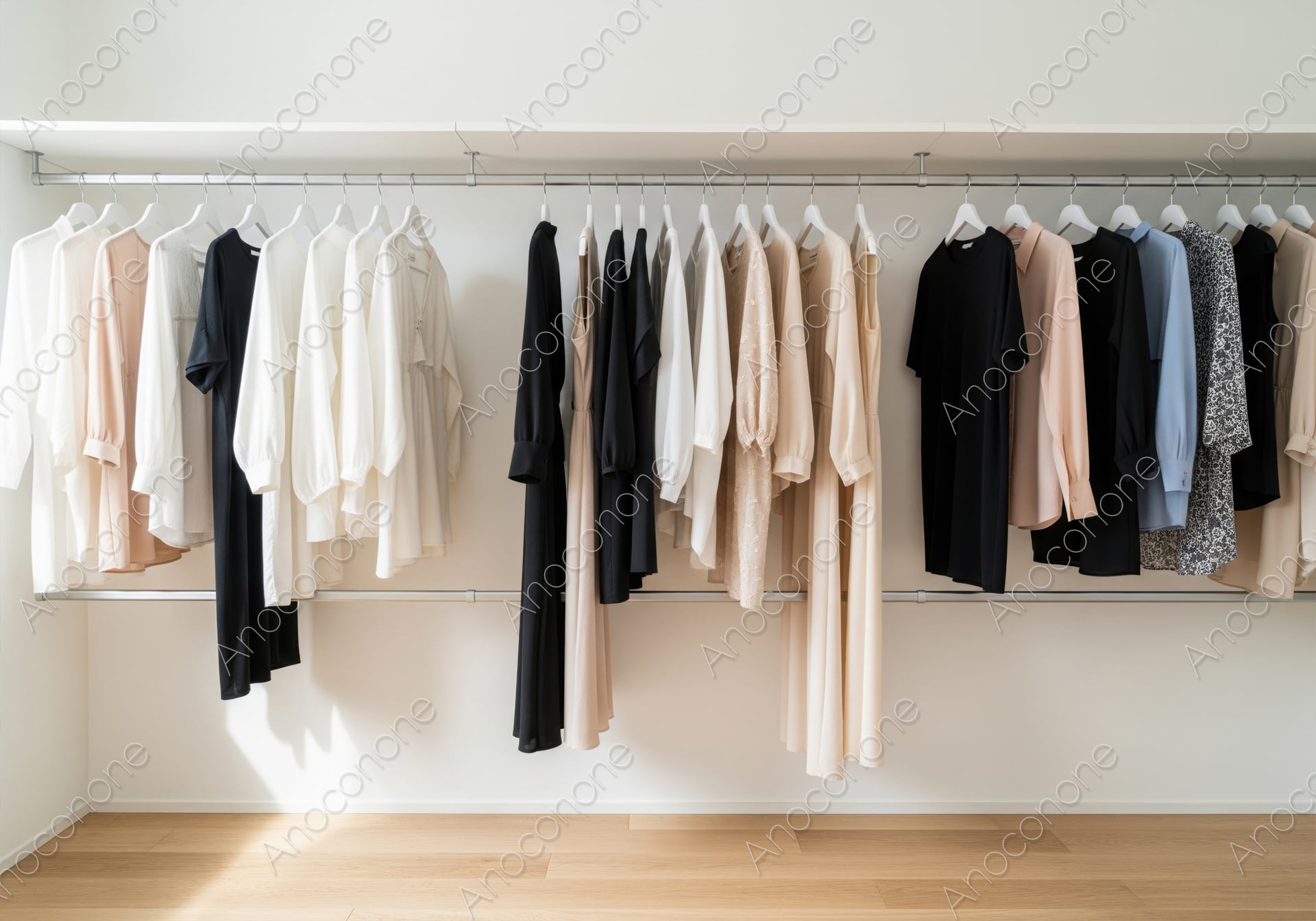 画像素材:白を基調としたミニマルな空間に、洗練された衣類が美しく整列しているウォークインクローゼットの風景です。ハンガーに掛けられたワンピースやブラウスは、白、ベージュ、黒のトーンで統一されており、シンプルながらも質の高いライフスタイルを象徴しています。壁面に無駄なく配置された収納システムと、フローリングに落ちる柔らかな自然光が、清潔感と開放感を演出しています。お気に入りの服を大切に扱う丁寧な暮らしを感じさせるこの一枚は、住宅のインテリアデザインや片付け術、スマートな収納を提案するメディアのアイキャッチ画像として非常に高い訴求力を持っています。