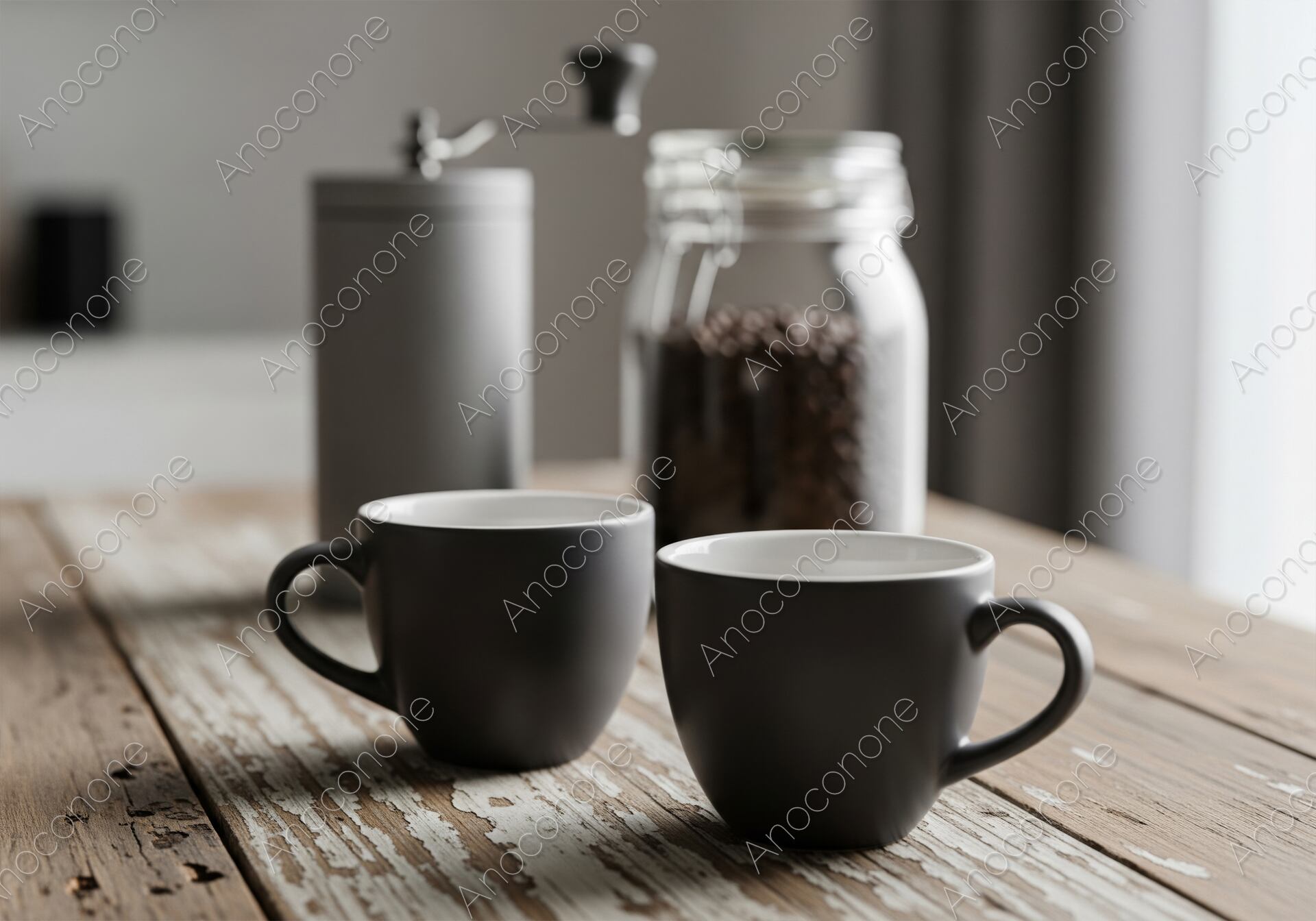画像素材:使い込まれた風合いが魅力的なヴィンテージ風の木製テーブルの上に、マットな質感のグレーのコーヒーカップが二つ並んでいます。背景にはスタイリッシュなコーヒーミルと、たっぷりのコーヒー豆が詰まったガラス瓶が置かれ、まるでお洒落なカフェの一角のような落ち着いた空間を演出しています。窓際からの柔らかな自然光が差し込み、静かな朝のひとときや大切な人とのティータイムを連想させる情緒的な一枚です。ライフスタイル系の雑誌、カフェの宣伝広告、または「丁寧な暮らし」をテーマにしたウェブサイトのアイキャッチ画像として非常に効果的です。