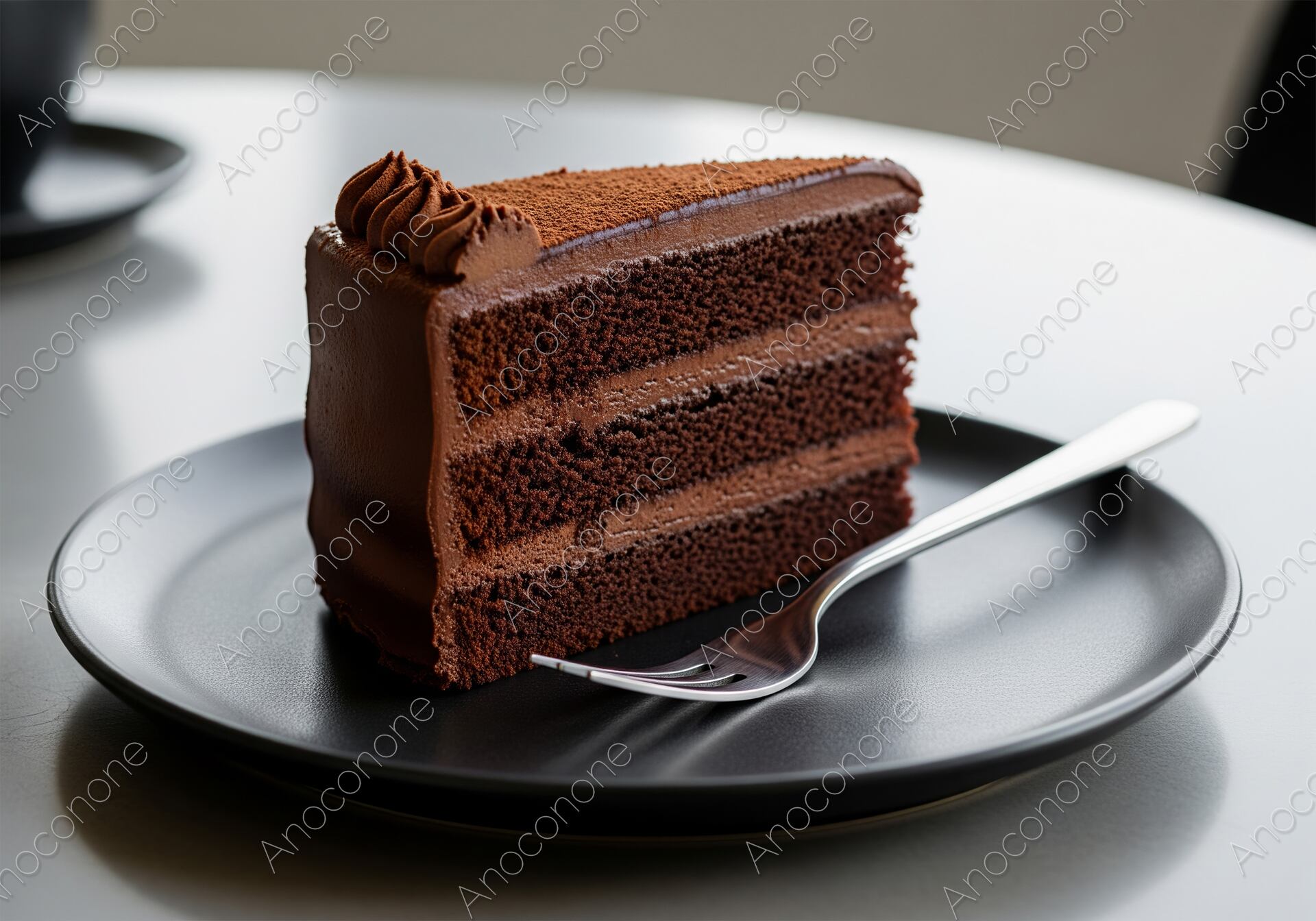 画像素材:しっとりとしたスポンジと濃厚なチョコクリームが美しい層を成す、贅沢なチョコレートケーキのカット画像です。表面には滑らかなグラサージュと繊細なデコレーションが施され、ココアパウダーの質感が食欲をそそります。モダンな黒いプレートにシルバーのフォークが添えられたスタイリッシュな構図は、洗練されたカフェの雰囲気を演出します。照明が際立たせるケーキの断面は、素材の良さと丁寧な仕上げを感じさせ、見る人を至福のひとときへと誘います。カフェのメニュー表やスイーツ特集のアイキャッチ、高級感のある広告デザインに最適な一枚です。