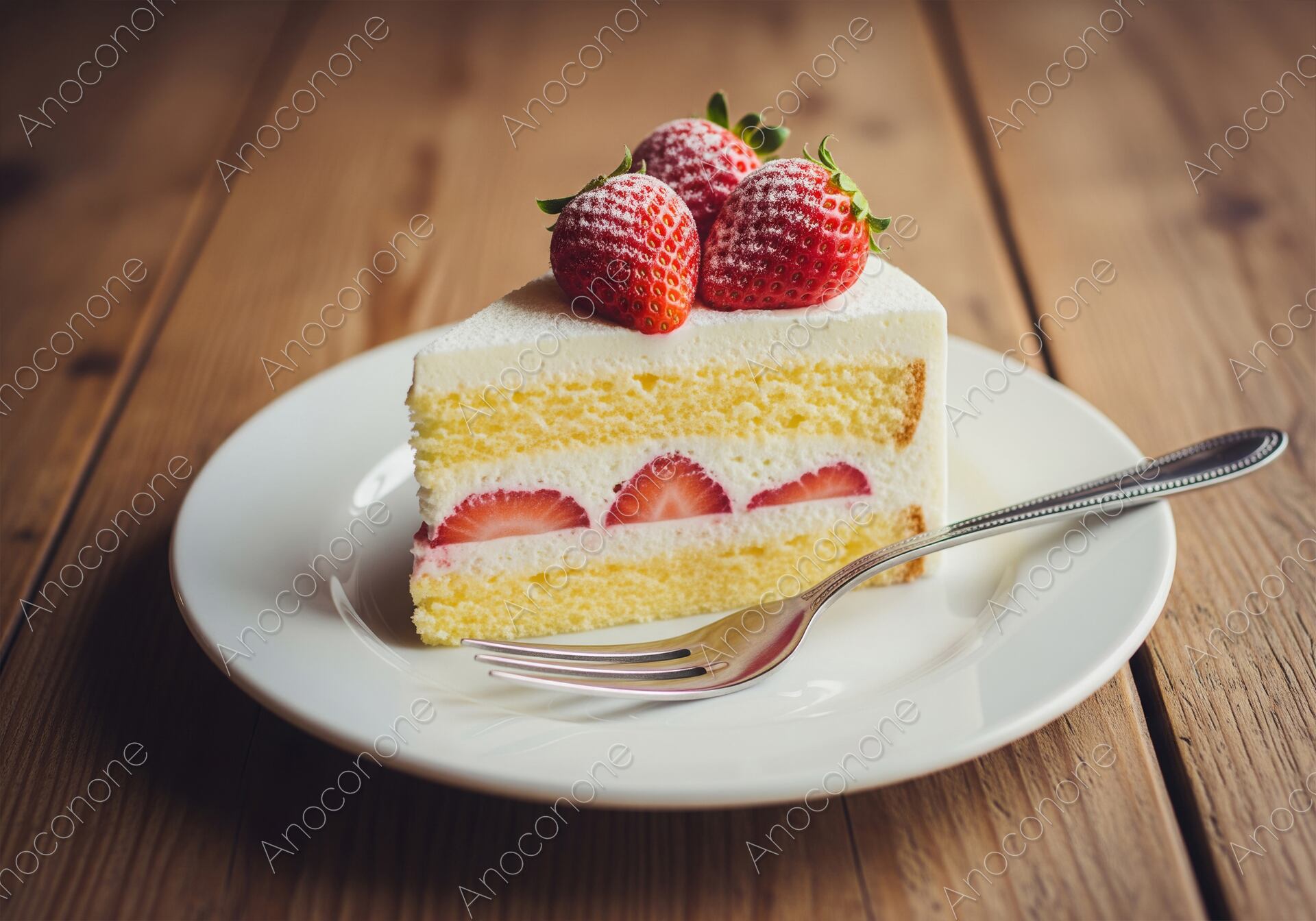 画像素材:みずみずしい大粒の苺を贅沢にトッピングした、王道のいちごショートケーキの画像です。きめ細やかでふんわりとしたスポンジ生地と、口どけの良い真っ白な生クリームが美しい層を成しています。断面からのぞく苺の赤色が鮮やかで、木目調のテーブルが温かみのある上品なティータイムのひとときを演出します。粉糖が軽く振られた苺の質感まで精細に捉えられており、見るだけで甘い香りが漂ってきそうなクオリティです。カフェのWebサイトや、季節のスイーツフェアを紹介するパンフレット、ギフト広告のメインビジュアルとして非常に効果的です。