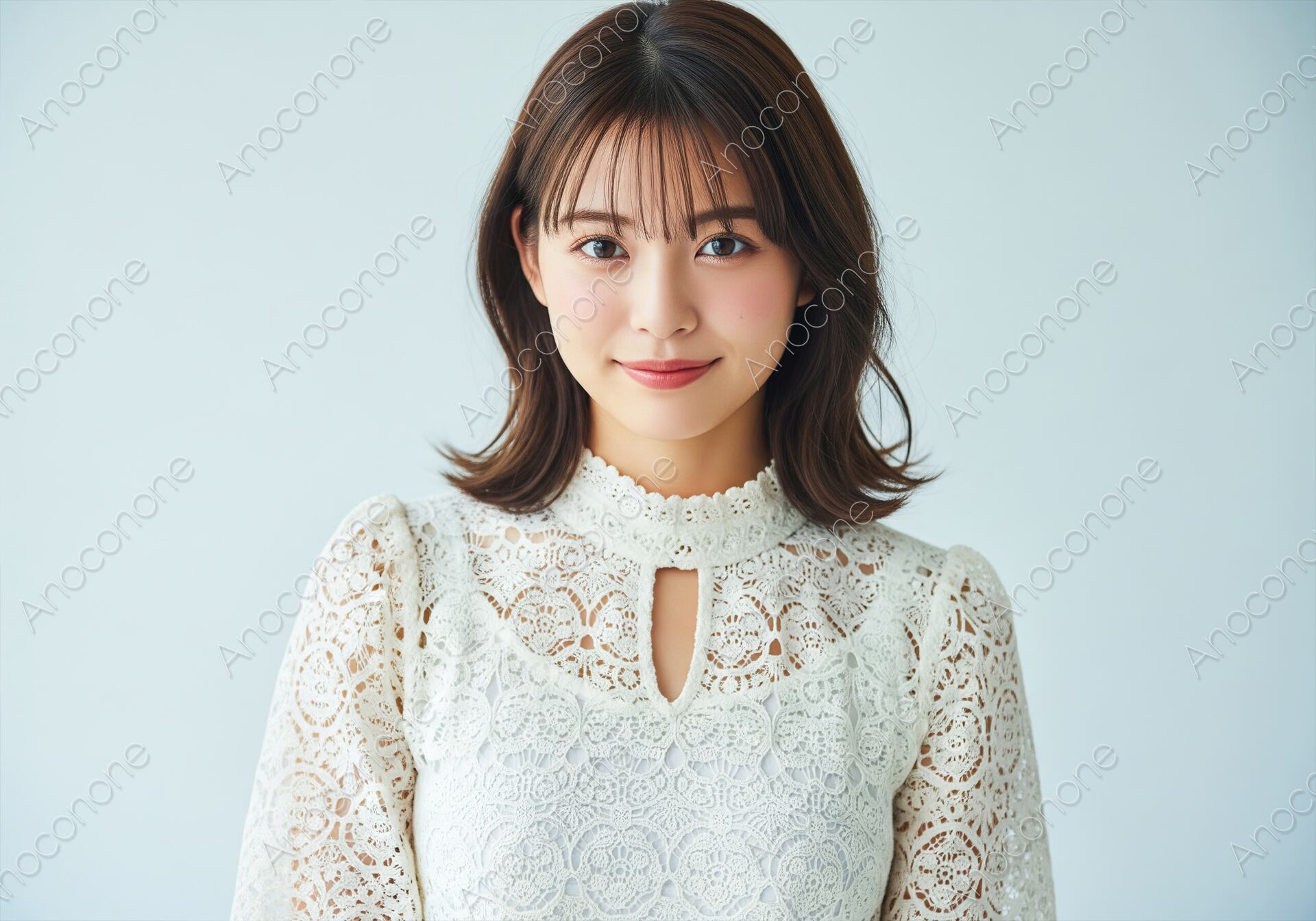 画像素材:細やかなクロシェ編みのレースが施された白いブラウスを纏い、優しく微笑む女性のポートレートです。明るく透明感のある背景が、彼女の清楚な顔立ちと柔らかなミディアムヘアをより一層引き立てています。ブラウスの繊細なディテールと、落ち着いたトーンのメイクが絶妙に調和し、洗練された大人の女性の美しさを演出しています。清潔感溢れる佇まいは、見る人に安心感と上品な印象を与えます。アパレルブランドのカタログや美容系のWebサイト、清潔感を重視する広告デザインのメインビジュアルに最適な一枚です。