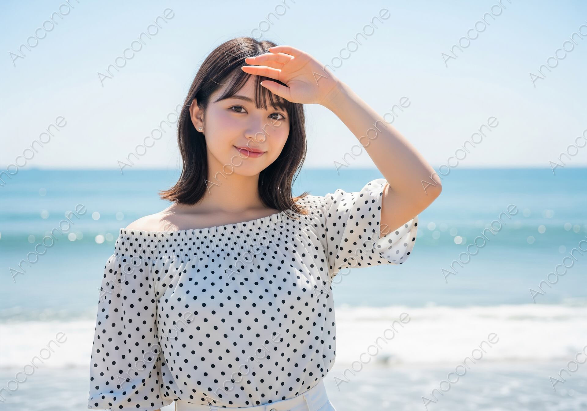 画像素材:雲ひとつない快晴の青空と穏やかな波が打ち寄せる海を背景に、まぶしそうに左手をかざして優しく微笑む若い女性の写真です。白地に黒の水玉模様が入ったオフショルダーのトップスが、夏の爽やかな雰囲気をより一層強調しています。背景の海面は強い太陽光を反射してきらきらと輝いており、開放的でリラックスした楽しい休日の空気感が伝わってきます。自然光に包まれた健康的な表情がとても魅力的です。夏の旅行の広告、リゾートファッションのウェブサイト、または爽やかなライフスタイルを提案するコンテンツのメインビジュアルとして最適です。