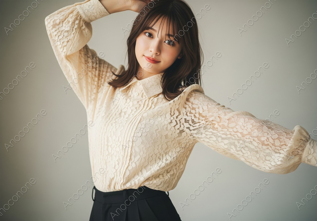 画像素材:繊細な花柄の総レースがあしらわれた、気品溢れるオフホワイトのブラウスを着こなす女性のカットです。柔らかな光が差し込むスタジオで、両手を軽く広げた軽やかなポーズが、洗練された大人の余裕とフェミニンな魅力を引き立てています。落ち着いたトーンの背景が被写体の透明感を際立たせ、清潔感のある上品な印象を与えます。アパレルブランドのカタログや美容・健康関連のウェブサイト、ライフスタイルを提案する雑誌の誌面など、質の高いビジュアルを求めるクリエイティブ制作に最適な一枚です。