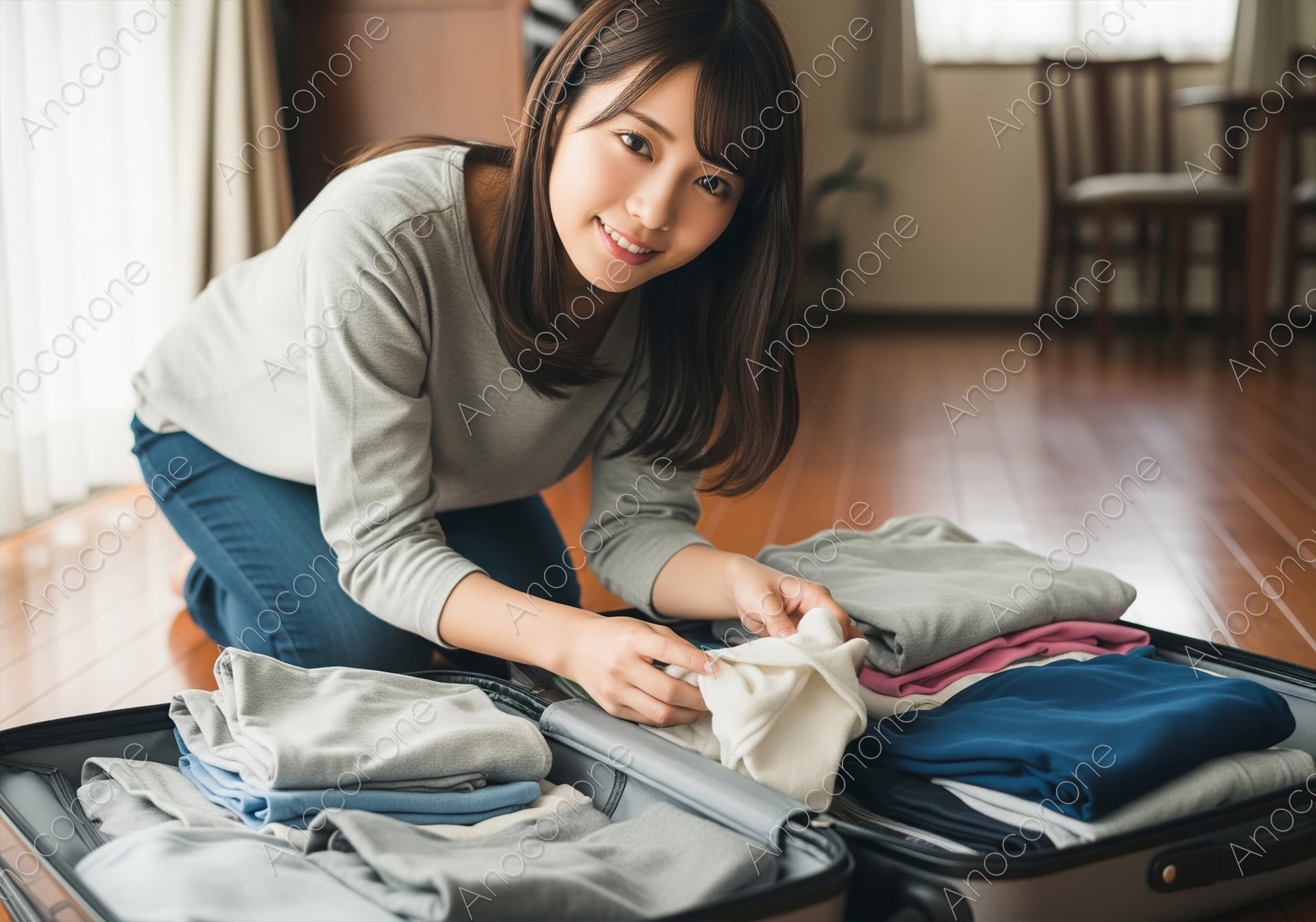 画像素材:出発を控えた高揚感に包まれながら、室内で丁寧にスーツケースのパッキングを行う女性の姿を捉えた一枚です。綺麗に折り畳まれた色とりどりの衣類を手に取り、カメラに向かって優しく微笑む表情からは、旅への期待と充実したプライベートの時間が伝わってきます。明るい自然光が差し込むフローリングの部屋は清潔感に溢れ、日常の何気ないシーンをドラマチックに演出しています。旅行代理店のプロモーション、収納術を紹介するライフスタイルメディア、または休暇をテーマにした広告ビジュアルなど、ターゲットの共感を呼ぶ親しみやすい素材として最適です。