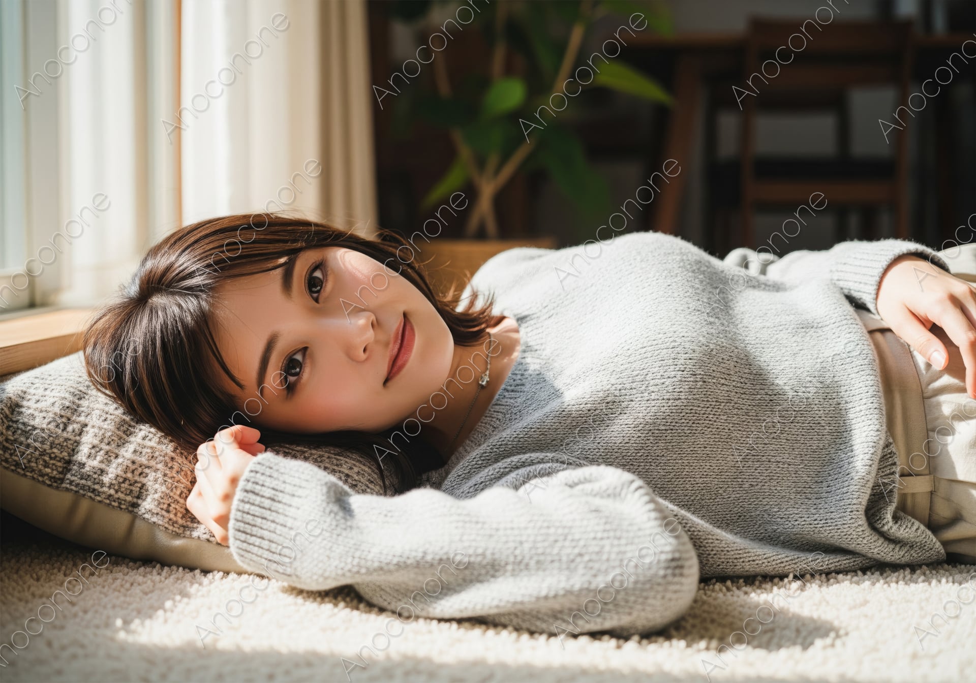 画像素材:窓から差し込む暖かな自然光を浴びながら、ラグの上でクッションを枕にゆったりと横たわる女性の姿を捉えた一枚です。柔らかなグレーのニットを身に纏い、カメラに向けて優しく微笑む表情からは、心安らぐ休日の穏やかな時間が伝わってきます。光の粒子が室内を包み込むような描写が、清潔感と温もりのある空間を美しく演出しています。リビングのインテリア紹介、冬のライフスタイル提案、またはリラクゼーションや美容関連の広告ビジュアルなど、ターゲットに「理想の日常」を感じさせる高品質な素材として最適です。