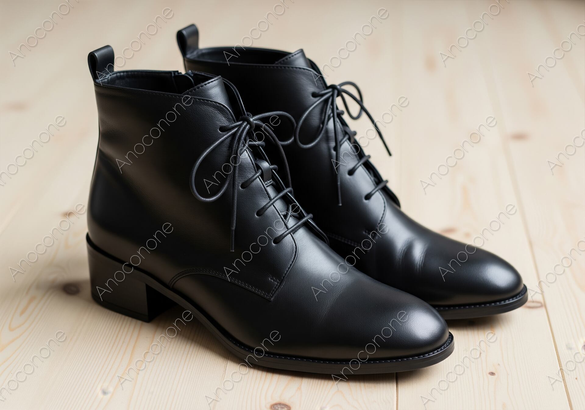 画像素材:きめ細やかな光沢を放つブラックの上質なレザーを使用した、クラシックかつモダンなレースアップブーツです。繊細に編み上げられた紐のディテールと、程よい高さのチャンキーヒールが、都会的で洗練された足元を演出します。柔らかな木のぬくもりを感じさせる背景が、ブーツの持つ高級感とシルエットの美しさを際立たせています。アパレルブランドのカタログや、秋冬のトレンドを提案するファッションメディア、また高品質なフットウェアの広告ビジュアルとして、ブランドのこだわりを伝えるのに最適な一枚です。