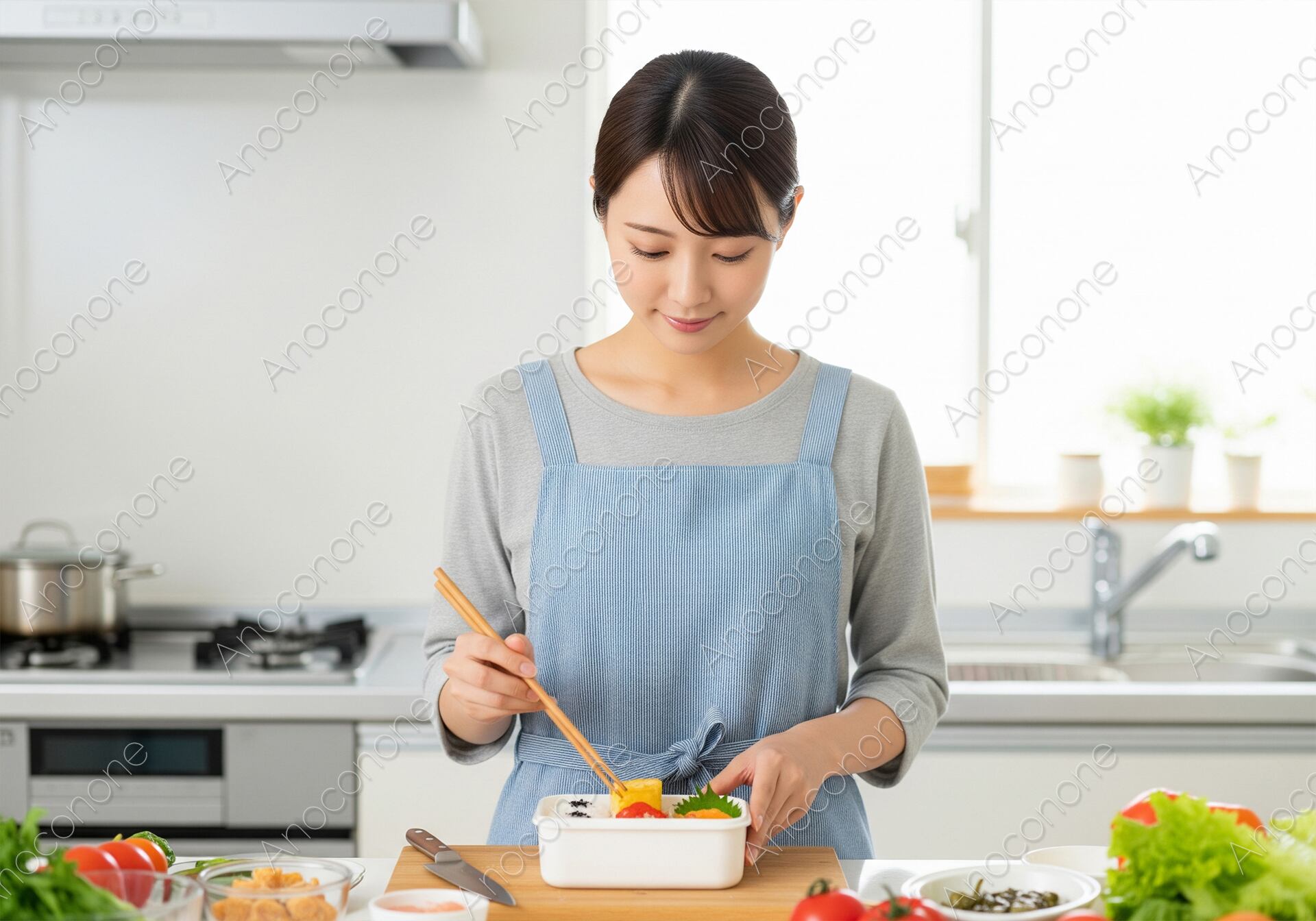画像素材:明るい自然光が差し込むキッチンで、水色のエプロンを身に纏った女性が丁寧にお弁当を盛り付けている様子を捉えた高品質な一枚です。彩り豊かな野菜や卵焼きをお箸で慎重に配置する姿からは、家族への愛情や日々の丁寧な暮らしぶりが伝わってきます。背景の清潔感あふれるシステムキッチンが、健康的で理想的なライフスタイルをより一層引き立てています。料理教室の広告や、家事代行サービスの販促、食育をテーマにしたブログ記事など、主婦層やファミリー層をターゲットにしたコンテンツに最適な素材です。