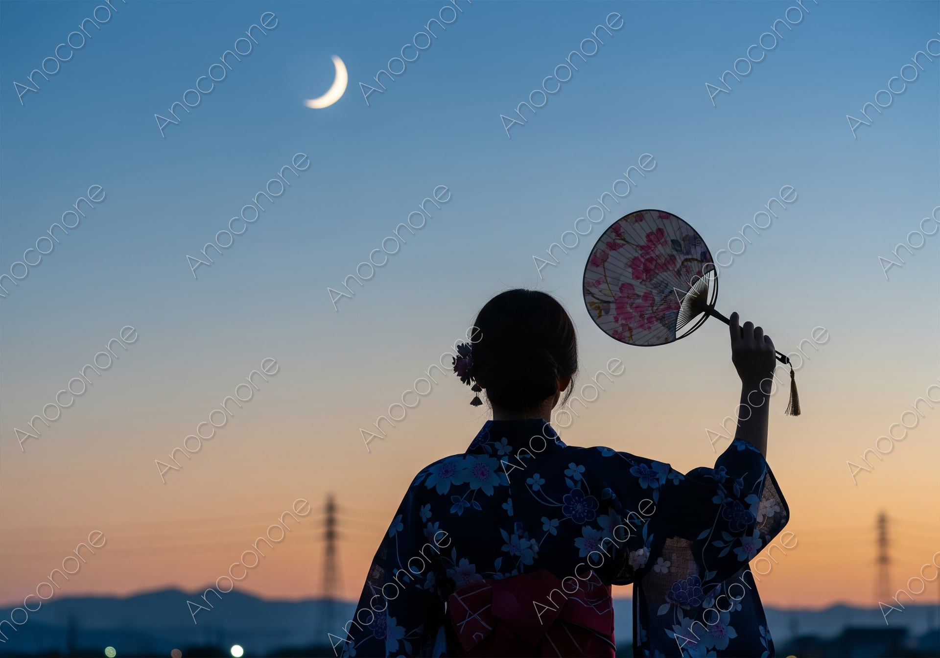 画像素材:燃えるような夕焼けが夜へと移り変わるマジックアワーの中、三日月を静かに見上げる浴衣姿の女性を捉えた叙情的な一枚です。紺地に花柄をあしらった和服のシルエットと、繊細な団扇を持つ手元が、日本の夏ならではの風情と涼しげな美しさを演出しています。遠くに見える街の灯りや山並みが、ノスタルジックな雰囲気をより一層引き立てており、見る人の心に深い感動を与えます。旅行業界のパンフレットや、和風イベントの告知、日本の四季を紹介するメディアなど、視覚的なインパクトを求めるデザインに最適な素材です。