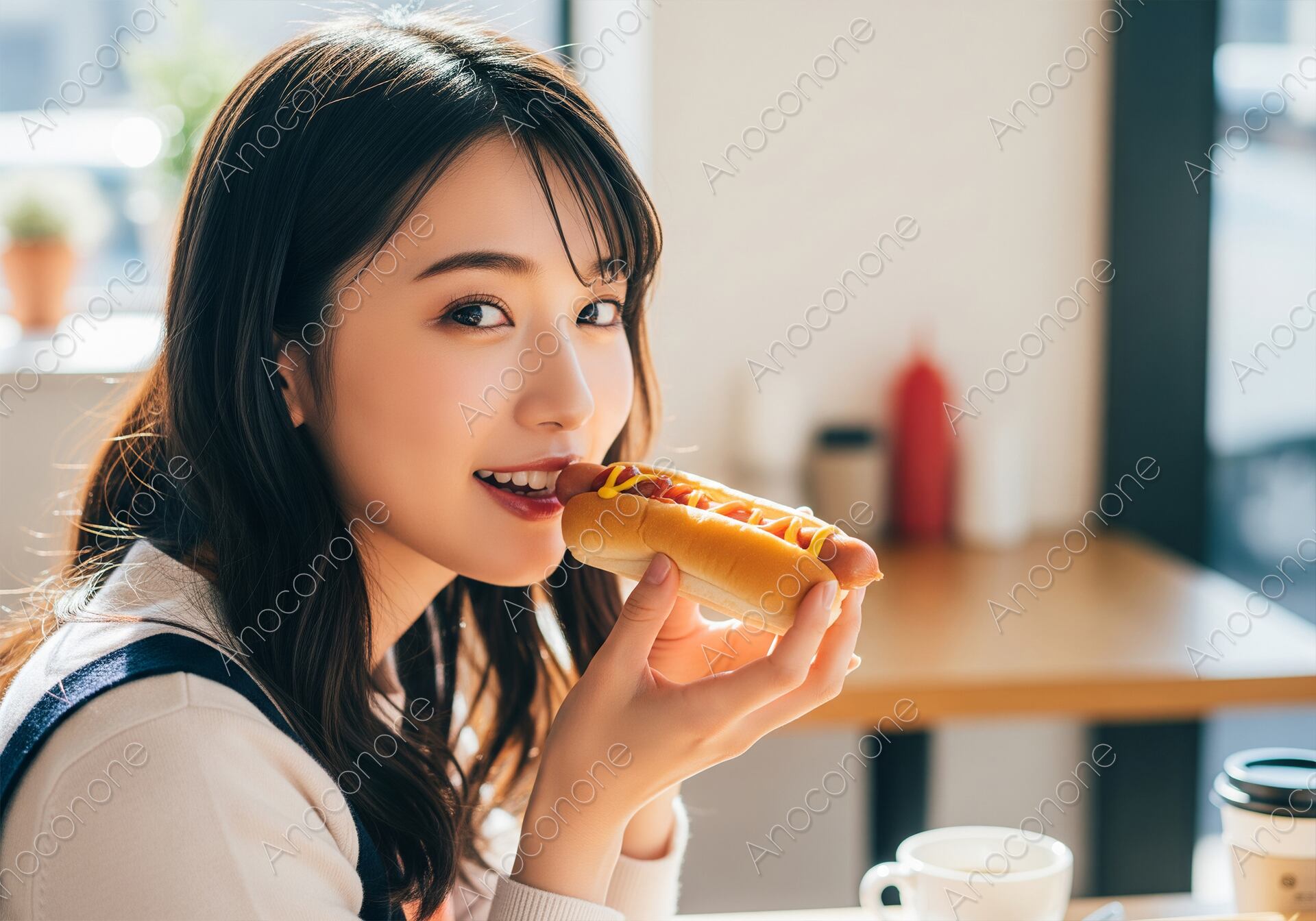 画像素材:陽光が降り注ぐ明るいカフェのテラス席で、ボリューム満点のホットドッグを手に取り、幸せそうな表情を浮かべる女性の姿を捉えた一枚です。こんがり焼けたパンに挟まれたジューシーなソーセージと、鮮やかなケチャップとマスタードのコントラストが食欲をそそり、女性の自然体な美しさと見事に調和しています。背景の柔らかな光が都会的で清潔感のある雰囲気を演出し、日常の何気ないランチタイムを特別な瞬間に変えています。飲食店のアドバタイジング、グルメ雑誌の表紙、ライフスタイルを提案するWEBメディアのビジュアル素材をお探しの方に最適な写真です。