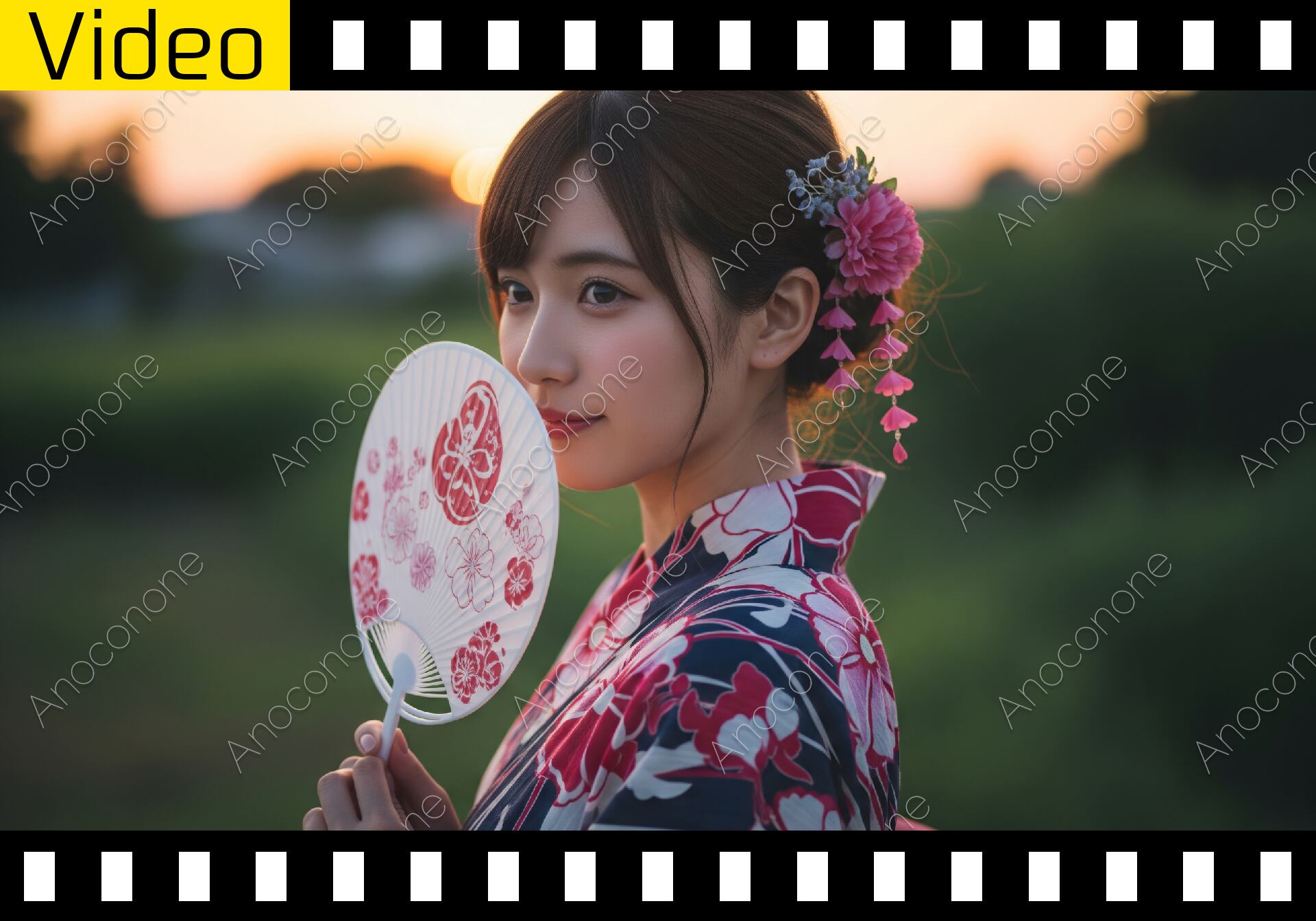動画素材:夕暮れ時の柔らかな光が差し込む庭園で、華やかな花柄の浴衣を身に纏った女性が涼やかに佇む情緒あふれる映像です。手にした団扇で顔を半分隠しながら、穏やかな微笑みを浮かべる仕草が、日本の夏の美しさと奥ゆかしさを象徴的に表現しています。背景のボケ味と夕陽のコントラストが被写体を引き立て、見る人の心に郷愁を呼び起こします。夏のイベント告知や、和風のプロモーション動画、観光ガイドなどの背景素材として、日本の夏を演出したいクリエイターの方に最適な素材です。