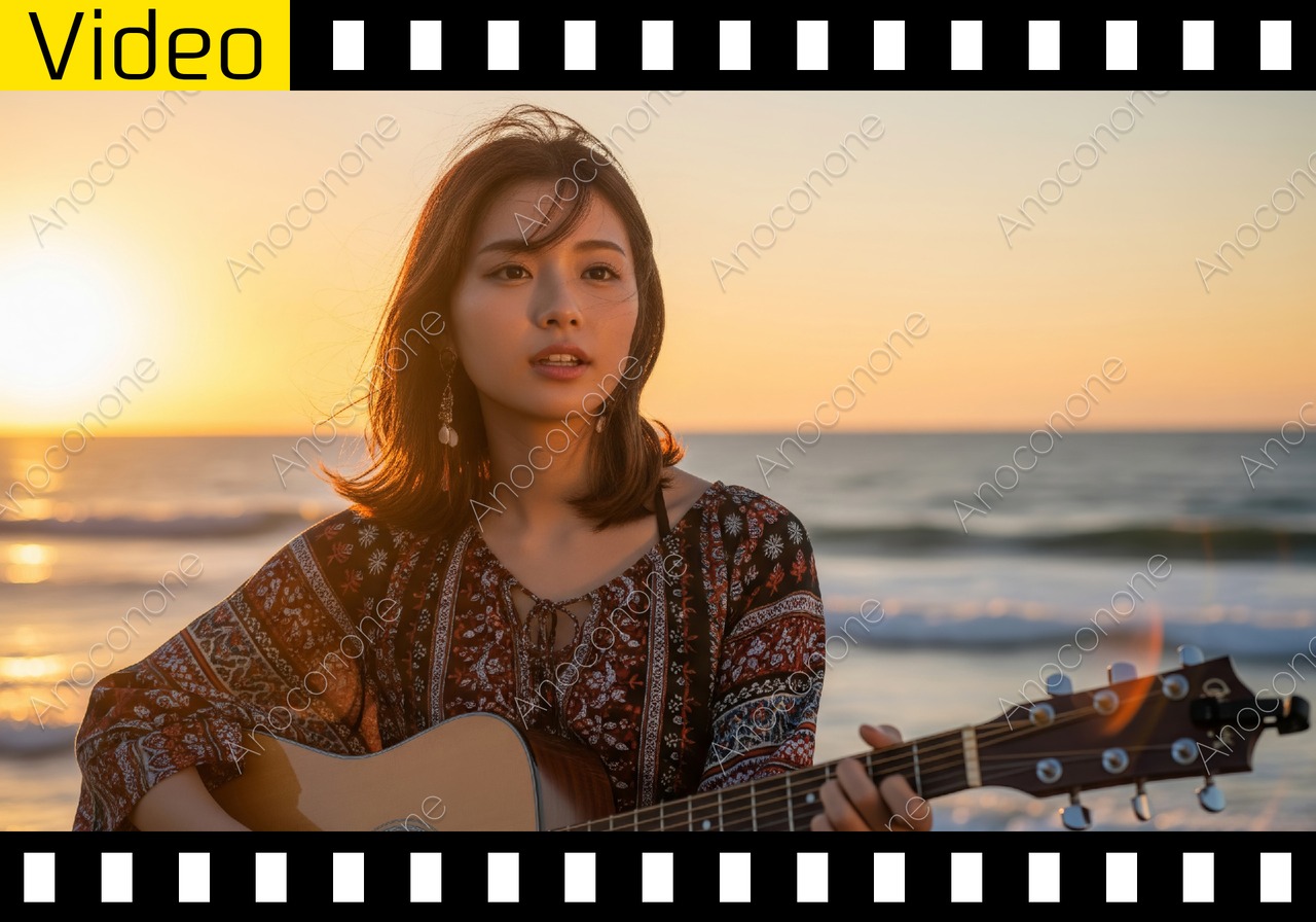 動画素材:黄金色に染まる夕暮れの海を背景に、アコースティックギターを奏でながら切なくも力強い歌声を響かせる女性を映し出した高品質な映像です。波の音と調和するように刻まれるリズム、そして沈みゆく太陽の光が彼女の表情をドラマチックに照らし出し、観る者の心に深い情景を刻みます。民族調のブラウスが風に揺れる様や、繊細な指の動きまで鮮明に描写されており、自由でアーティスティックな世界観が画面いっぱいに広がります。音楽関連のプロモーション、映画のような旅の回想シーン、あるいはエモーショナルな物語を演出したい動画クリエイターの方に最適な素材です。