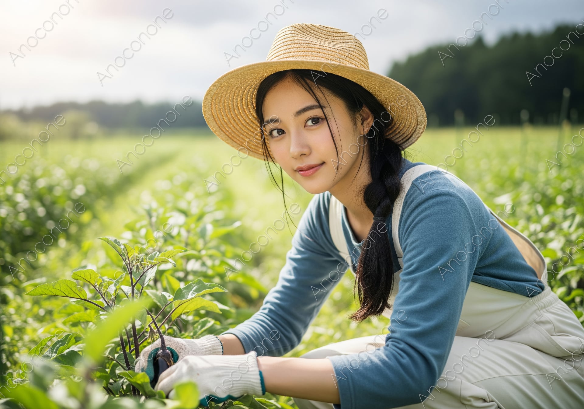 画像素材:柔らかな陽光が降り注ぐ広大な農園で、丁寧に育てられたナスを収穫する女性の姿を捉えた高品質な一枚です。清潔感のある白いオーバーオールと麦わら帽子を身にまとい、三つ編みに結った髪が健康的でナチュラルな美しさを引き立てています。背景には青々と茂る野菜畑が広がり、自然の豊かさと農業の楽しさが伝わってくる構図となっています。細部まで鮮明に描かれたこの画像は、オーガニック製品の広告や農業体験のパンフレット、健康的なライフスタイルを提案するWebサイトのメインビジュアルとして最適です。