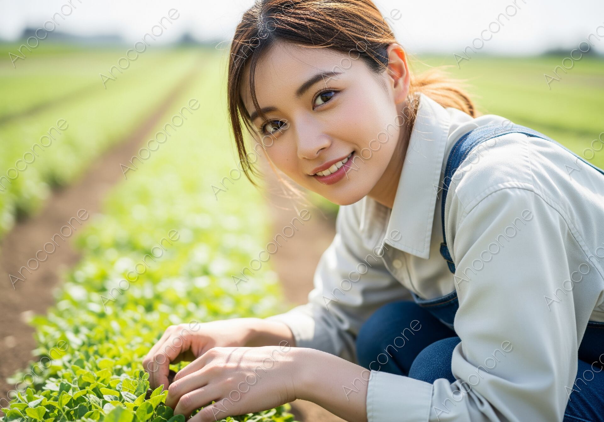 画像素材:見渡す限り広がる青々とした農園で、しゃがみ込みながら若葉の手入れを丁寧に行う女性の生き生きとした表情を捉えた高品質な一枚です。柔らかな陽光を浴びながら、自然と触れ合う喜びが伝わってくるような明るい笑顔が印象的です。カジュアルな作業服をスマートに着こなし、健康的でナチュラルな美しさが際立っています。奥行きのある畑の風景と、手元の鮮やかな緑のコントラストが非常に美しく、視聴者に清々しい印象を与えます。この画像は、農業振興のプロモーション、食育関連のコンテンツ、または週末の趣味として家庭菜園を推奨するライフスタイル誌の挿絵やWeb広告の素材として大変おすすめです。