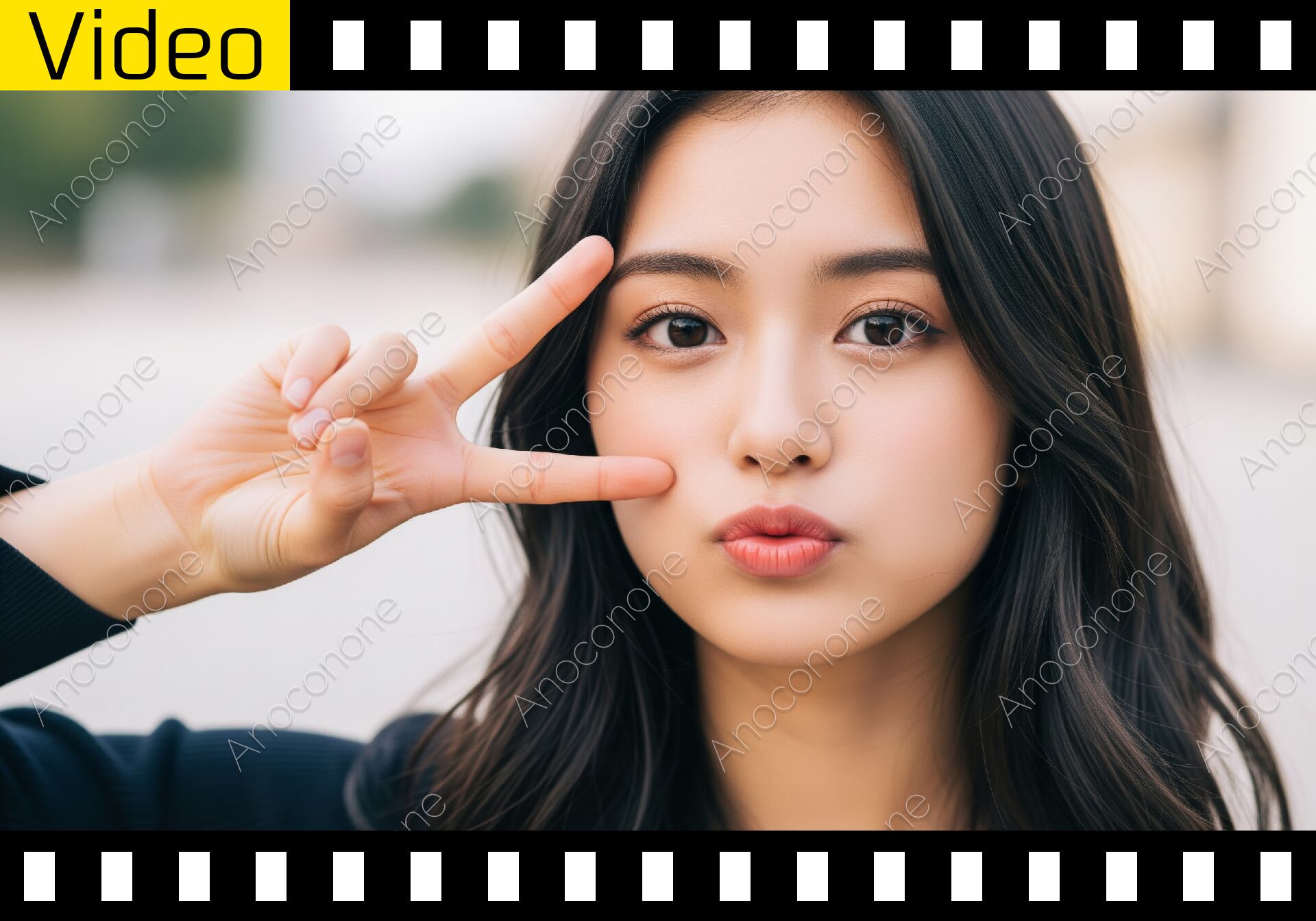動画素材:カメラを真っ直ぐに見つめながら、指でピースサインを作って頬に寄せる仕草が愛らしい女性のアップ映像です。柔らかな質感の黒髪と、少し尖らせた唇がチャームポイントで、視聴者の視線を一瞬で釘付けにする魅力を持っています。背景をぼかしたポートレートスタイルの構図により、彼女の透明感あふれる肌や瞳の輝きがより一層際立っています。親しみやすさと可愛らしさを兼ね備えたこの素材は、SNS向けの広告動画や、若年層をターゲットにしたライフスタイル系のコンテンツ制作に非常に効果的です。