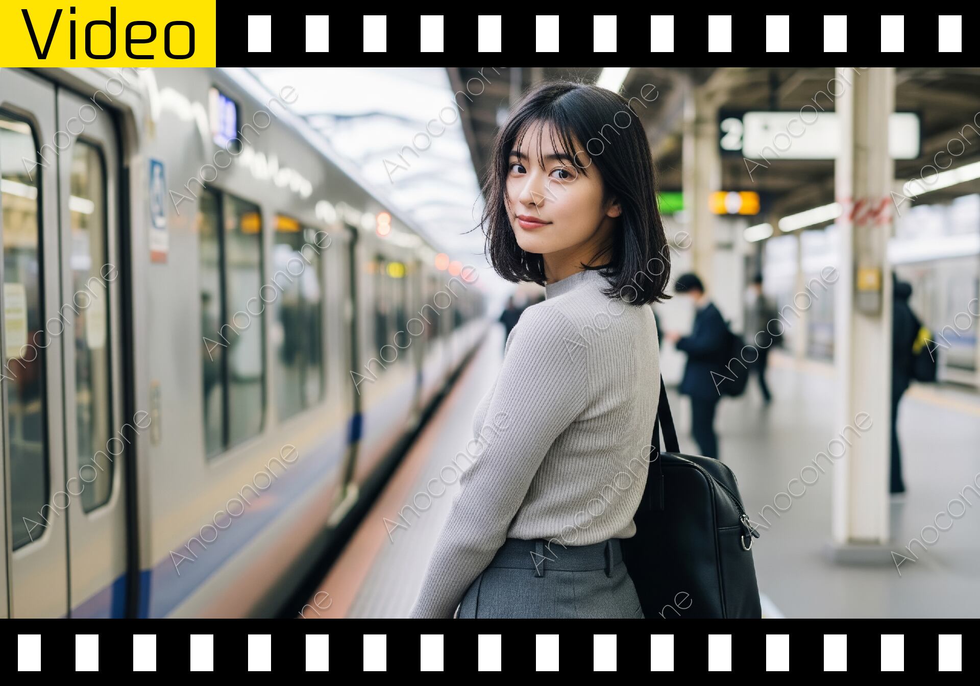 動画素材:活気ある都会の駅のホームで、入線する電車を背にふと振り返り、穏やかな微笑みを浮かべる女性の映像です。落ち着いたグレーのニットにスラックス、黒のショルダーバッグを合わせた知的な秋の装いが、洗練された都会の日常を演出しています。ボブヘアが風に軽く揺れ、彼女の自然体な美しさと透明感のある表情が、行き交う人々の中でもひときわ輝いて見えます。通勤・通学のワンシーンや、都会を舞台にしたライフスタイル広告、あるいは新しい場所への旅立ちをテーマにしたドラマチックなプロモーションに最適な、リアリティと情緒を兼ね備えた高品質素材です。