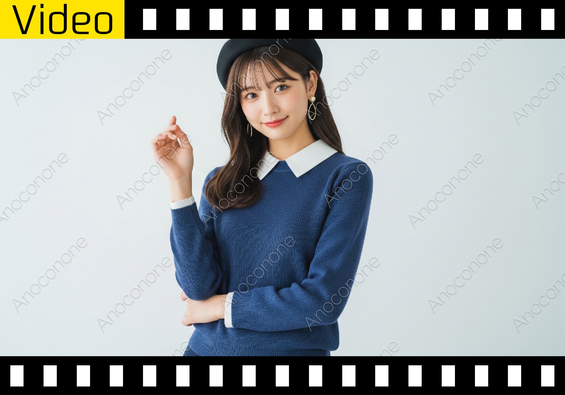 動画素材:黒いベレー帽に白い襟の付いた紺色のニットを合わせた、清潔感のある春の装いの女性を正面から捉えています。女性は軽く腕を組み、指先を口元に近づけるような上品な仕草を見せながら、穏やかな笑みを浮かべています。背景はシンプルな明るいグレーの無地となっており、被写体のファッションや表情がより際立つ構成です。髪は緩やかに巻かれたロングヘアで、耳元で揺れるゴールドのイヤリングがアクセントになっています。全体的に落ち着いたトーンでまとめられており、都会的で洗練された雰囲気が漂っています。ライティングは柔らかく、肌の質感や衣服の編み目まで丁寧に描写されているのが特徴です。人物の動きは最小限で、静止画のような安定感のある構図となっています。ファッション誌のワンシーンのようなこの映像は、アパレル広告やライフスタイルをテーマにした動画制作に最適です。