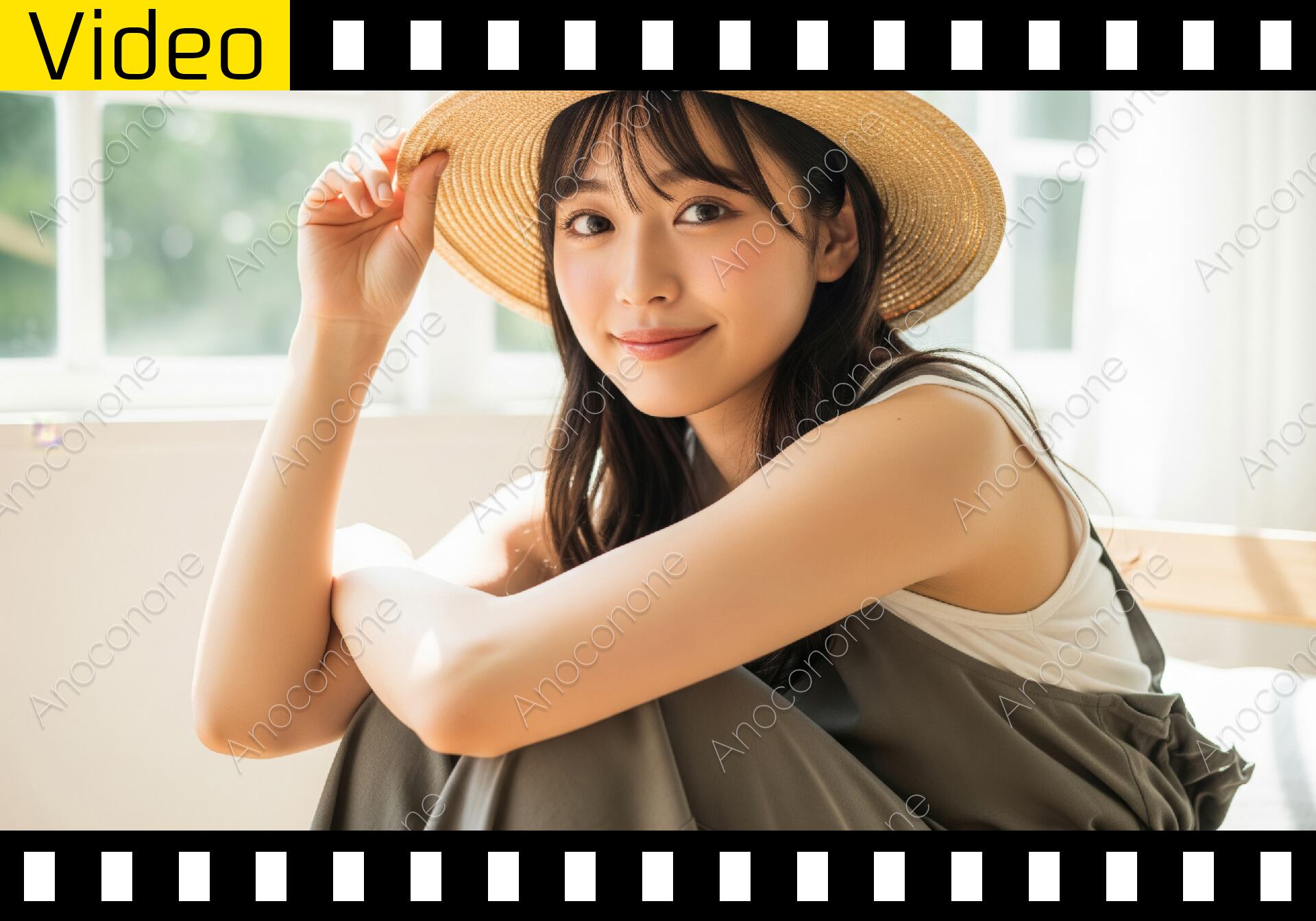 動画素材:明るい日差しが差し込む白い窓際で、麦わら帽子を被りながら膝を抱えて座る女性の姿を捉えています。女性は帽子のつばに優しく手を添え、穏やかで親しみやすい微笑みをこちらに向けています。白のインナーにカーキ色のジャンパースカートを合わせた夏らしいコーディネートが、彼女の清楚な雰囲気をより引き立てています。背景の窓からは柔らかな光が溢れ、室内の温かみのある空気感と調和して、清々しい午後のひとときを演出しています。髪の質感や帽子の編み目、そして肌の透明感までが細やかに描写されており、視聴者に安らぎを与えるような自然なトーンで構成されています。全体的に清潔感があり、シンプルながらも季節感あふれる美しい映像表現が特徴となっています。夏のライフスタイルや旅行、ファッション関連のプロモーション映像に最適です。