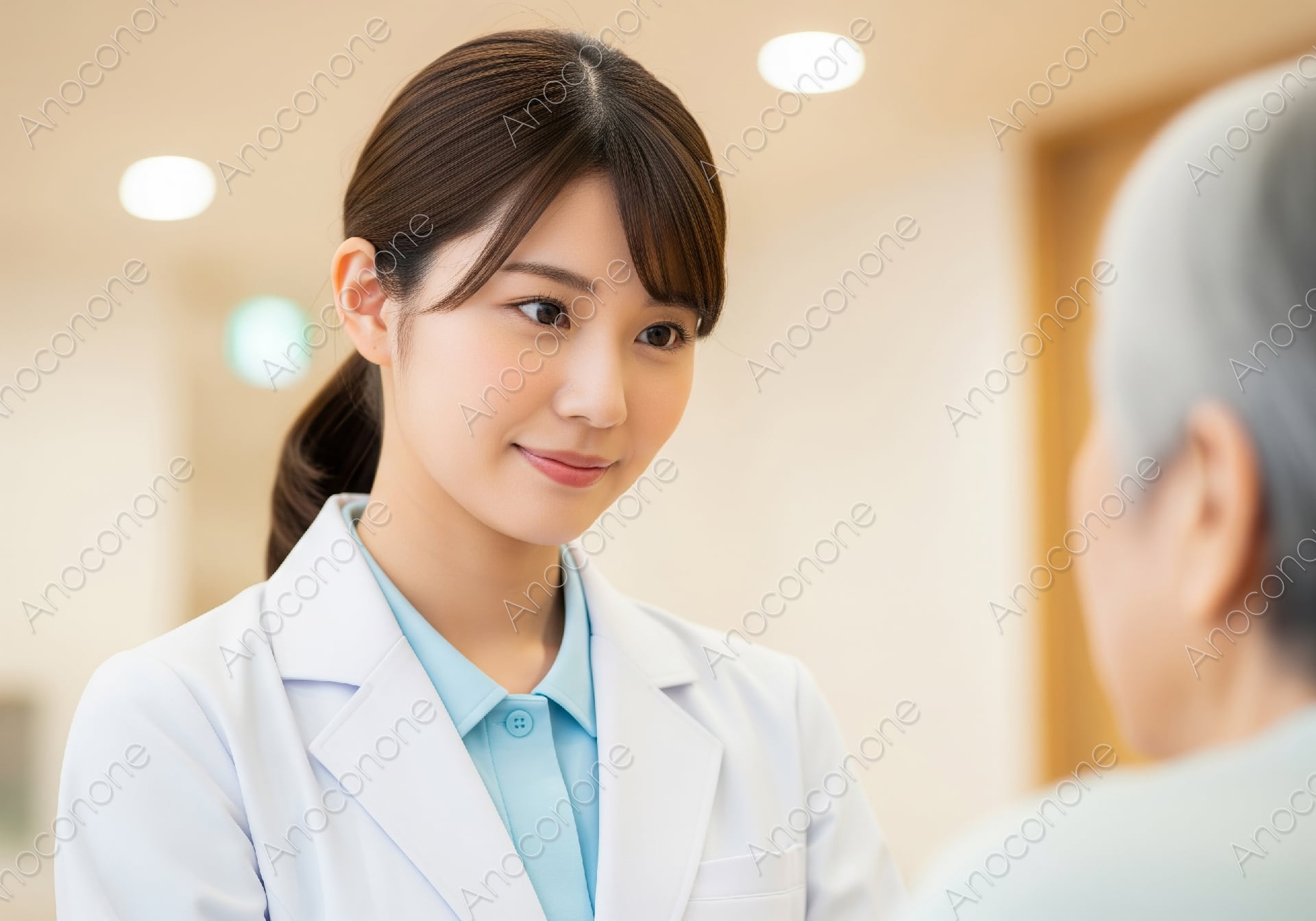 画像素材:穏やかな光が差し込む清潔な介護施設で、高齢の入居者と対面し、優しく微笑みを浮かべる介護スタッフ(女性)のポートレートです。水色のポロシャツに白のジャケットを羽織った清潔感のある装いが、福祉のプロフェッショナルとしての信頼感と誠実さを感じさせます。相手の言葉に静かに耳を傾け、温かく包み込むような彼女の眼差しは、日々の生活に安心感をもたらす献身的なケアを象徴しています。背景には木のぬくもりを感じさせる室内や柔らかな照明が配され、施設全体の家庭的で落ち着いた雰囲気を表現しています。きっちりとまとめられたヘアスタイルや、健康的で透明感のある肌の質感が、見る人に清々しくポジティブな印象を与えます。入居者との確かな信頼関係を感じさせるこの一枚は、高齢者向け住宅のパンフレット、介護サービスの公式ウェブサイト、福祉関連の求人募集や広報資料など、真心あるサポートを伝えたいあらゆるデザインに最適です。