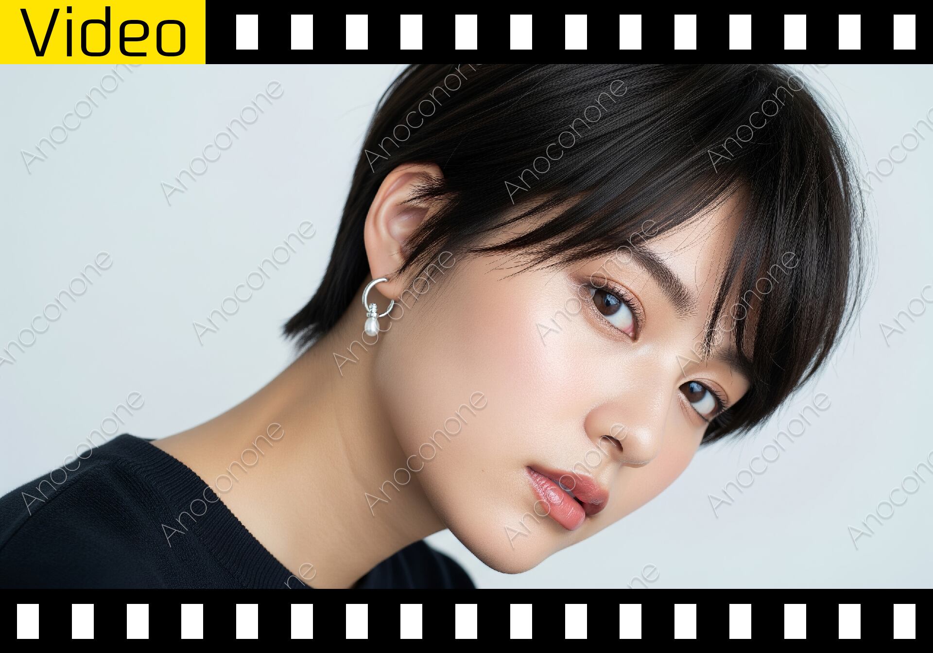 動画素材:短い黒髪が印象的な女性が、静かな空間の中でカメラを真っ直ぐに見つめています。彼女の涼しげな目元と整った顔立ちが、シンプルながらも強い存在感を放っています。耳元で揺れるパールのピアスが、落ち着いた黒いトップスに上品な輝きを添えています。光の当たり方が絶妙で、肌の透明感や髪の質感が細部まで鮮明に映し出されています。余計な装飾を省いた背景が、彼女の持つ凛とした美しさをより一層際立たせています。視線を僅かに動かす仕草は、見る人を引き込むような魅力があり、短時間の映像ながら深く記憶に残ります。洗練された都会的なイメージや、ビューティー関連の高品質な広告映像に適した内容です。美容室のプロモーションや、大人の女性向けブランドの紹介に役立ちます。