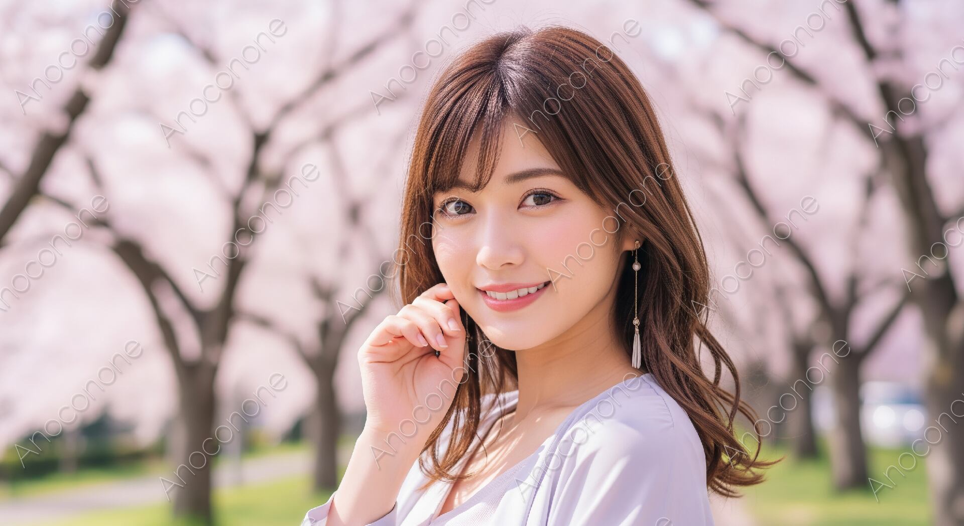 淡いピンク色の桜が咲き誇る並木道で、柔らかな光に包まれた女性がこちらを見つめています。彼女の髪は緩やかにウェーブしており、春の風を感じさせる軽やかな印象を与えます。耳元で揺れる繊細なアクセサリーが、清楚な雰囲気を引き立てています。背景の桜は美しくぼかされており、被写体である彼女の透明感のある表情がより際立つ構成となっています。服装は落ち着いた色合いのトップスを選んでおり、春の穏やかな気候に馴染む装いです。木漏れ日が肌に優しく落ち、自然な陰影が顔立ちを立体的に見せています。公園のような開かれた場所での一コマは、見る人に爽やかで前向きな印象を与えます。季節感のある広告や、ライフスタイルを紹介するブログのメインビジュアルに活用できる一枚です。