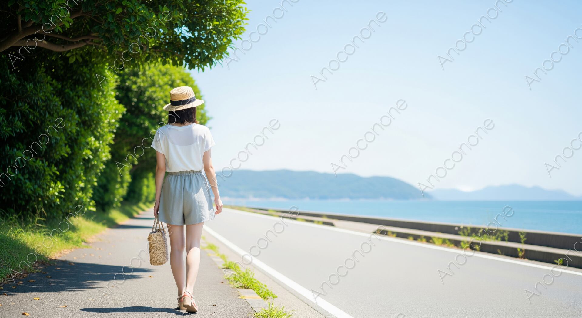 輝く太陽の下、どこまでも続くような海岸沿いの道を、一人の女性がゆったりと歩いています。白いトップスにグレーのショートパンツを合わせ、麦わら帽子を被った後ろ姿からは、夏の休日を満喫するリラックスした雰囲気が伝わってきます。左手には涼しげなカゴバッグを持ち、足元は歩きやすいサンダルでまとめられており、季節感あふれる軽やかな装いです。道の左側には青々とした木々が茂り、右側には穏やかな青い海と遠くの山並みが広がっています。澄み渡った空と海のコントラストが美しく、画面全体に開放感と爽やかな風を感じさせる構図です。日差しは明るく、路面に落ちる木陰や草花の緑が、自然豊かな環境での散歩をより魅力的に演出しています。旅行のプロモーションや、夏をテーマにしたライフスタイルメディアの背景画像にぴったりの一枚です。