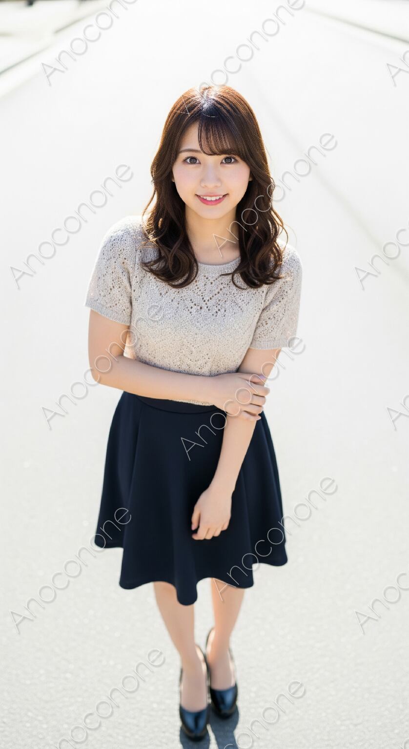 画像素材:明るい日差しが降り注ぐ屋外で、カメラを見つめて優しく微笑む人物を俯瞰気味のアングルから捉えた一枚です。トップスには、繊細な透かし編みが施されたライトベージュの半袖レースニットを着用しています。このニットは落ち着いた色合いでありながら、編み目の模様が上品な華やかさを演出しています。ボトムスには、深いネイビーのフレアスカートを合わせており、全体のシルエットをきれいに引き締めています。足元は黒いパンプスで整えられており、清楚で清潔感のあるコーディネートが完成されています。軽く波打つようなウェーブのかかったロングヘアが、柔らかい雰囲気をさらに引き立てています。背景は明るくぼかされており、被写体の存在感が際立つ構成です。春夏の爽やかな季節感を感じさせる、ナチュラルな美しさが表現されています。ファッション誌やカタログのイメージカットに最適です。