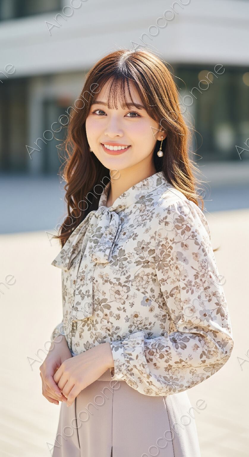 画像素材:明るい日差しが差し込む屋外を背景に、華やかな花柄のブラウスを身にまとった人物が、穏やかな笑顔で佇んでいる様子を捉えています。ブラウスは淡いベージュを基調とした落ち着いた色合いで、全体に繊細な草花の模様が描かれています。首元には共布のボウタイがあしらわれており、上品でクラシカルな印象を添えています。袖口はふんわりとしたパフスリーブのような形状で、柔らかな女性らしさを強調するデザインです。ボトムスにはブラウスの色味に合わせたピンクベージュのパンツを組み合わせており、全体のトーンが統一された洗練されたコーディネートになっています。耳元で揺れるパールのイヤリングが、顔周りに明るいアクセントを加えています。ウェーブのかかったロングヘアが光を反射して輝き、健康的で清潔感のある雰囲気が漂っています。背景は都会的な建物の前となっており、日常のワンシーンを美しく切り取っています。春のファッション特集や広告ビジュアルに活用できる一枚です。