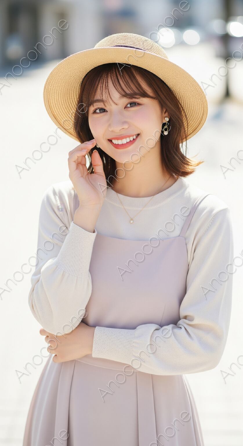 画像素材:明るい日差しが降り注ぐ屋外で、季節感のある麦わら帽子を被った人物が優しく微笑んでいる様子を捉えたポートレートです。着用しているのは、柔らかなオフホワイトの長袖ニットに、淡いピンク色のキャミソールワンピースを重ねたレイヤードスタイルです。ニットの袖口はリブ仕様になっており、ふんわりとしたシルエットが優雅な印象を与えています。頭に載せたストローハットは、広めのツバが顔周りに柔らかな影を作り、涼しげで清楚な雰囲気を引き立てています。耳元には小ぶりなパールのイヤリングが光り、首元の細いネックレスとともに上品なアクセントとなっています。軽く外側に跳ねたボブヘアが快活な印象を与え、オレンジ系のリップが健康的な表情をより明るく見せています。背景は白を基調とした街並みがぼかされており、被写体の透明感が際立つ構成です。春夏の旅行やデートシーンをイメージした広告素材に適した一枚です。