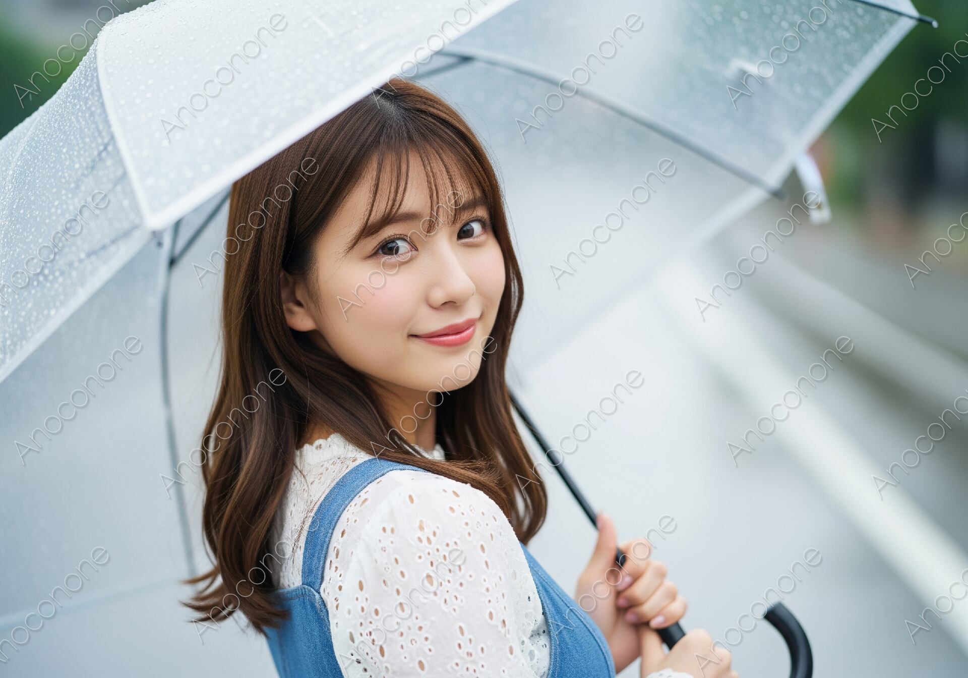 画像素材:雨が降る屋外で透明なビニール傘を差し、こちらを振り返りながら微笑む女性を正面に近い角度から捉えたポートレートです。女性は白のレースがあしらわれたトップスにブルーのデニム生地のようなオーバーオールを合わせており、清潔感のあるカジュアルな装いです。ゆるやかに波打つ茶髪のロングヘアが肩にかかり、しっとりとした雨の日の雰囲気を引き立てています。傘の表面には細かな雨粒が均一に付着しており、背景の街並みが淡くぼかされていることで、被写体である女性の存在感が際立っています。肌の色つやは健康的で、穏やかな目元と口元の笑みが安心感を与えます。雨天時のシチュエーションながらも画面全体が明るく、爽やかな印象を与える構成です。傘を持つ手の表情や髪の質感まで細かく描写されており、日常の何気ない瞬間を美しく切り取っています。雨の日のライフスタイルを伝える広告素材として活用いただけます。