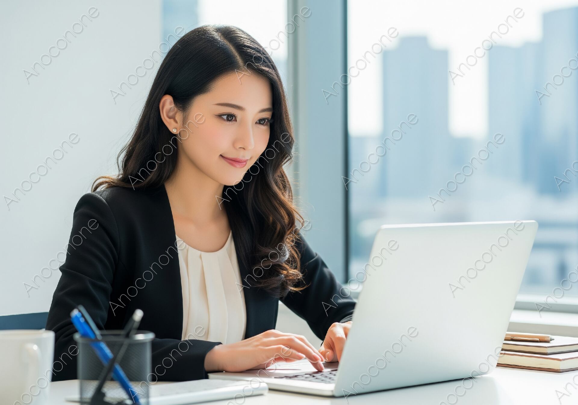 画像素材:高層ビルが窓の外に広がる開放的なオフィス環境で、ノートパソコンに向かって作業を行う女性の姿を捉えた一枚です。女性は黒のジャケットに白いインナーを合わせた清潔感のあるビジネススタイルで、落ち着いた表情で画面を見つめています。緩やかに巻かれた黒髪が上品な印象を与え、デスク周りにはペン立てやノートが整然と配置されており、効率的に業務をこなすプロフェッショナルな雰囲気が漂っています。自然光が差し込む明るい室内は、誠実さや信頼感を感じさせる空間となっており、集中して仕事に取り組む様子が伝わります。背景の都会的な景観は適度にぼかされており、被写体である女性の存在感をより一層引き立てる構成です。オフィスワークの日常やキャリア、ビジネススキルの向上をテーマにしたコンテンツに最適な素材です。働く女性のライフスタイルを表現する広告やブログのアイキャッチに活用いただけます。