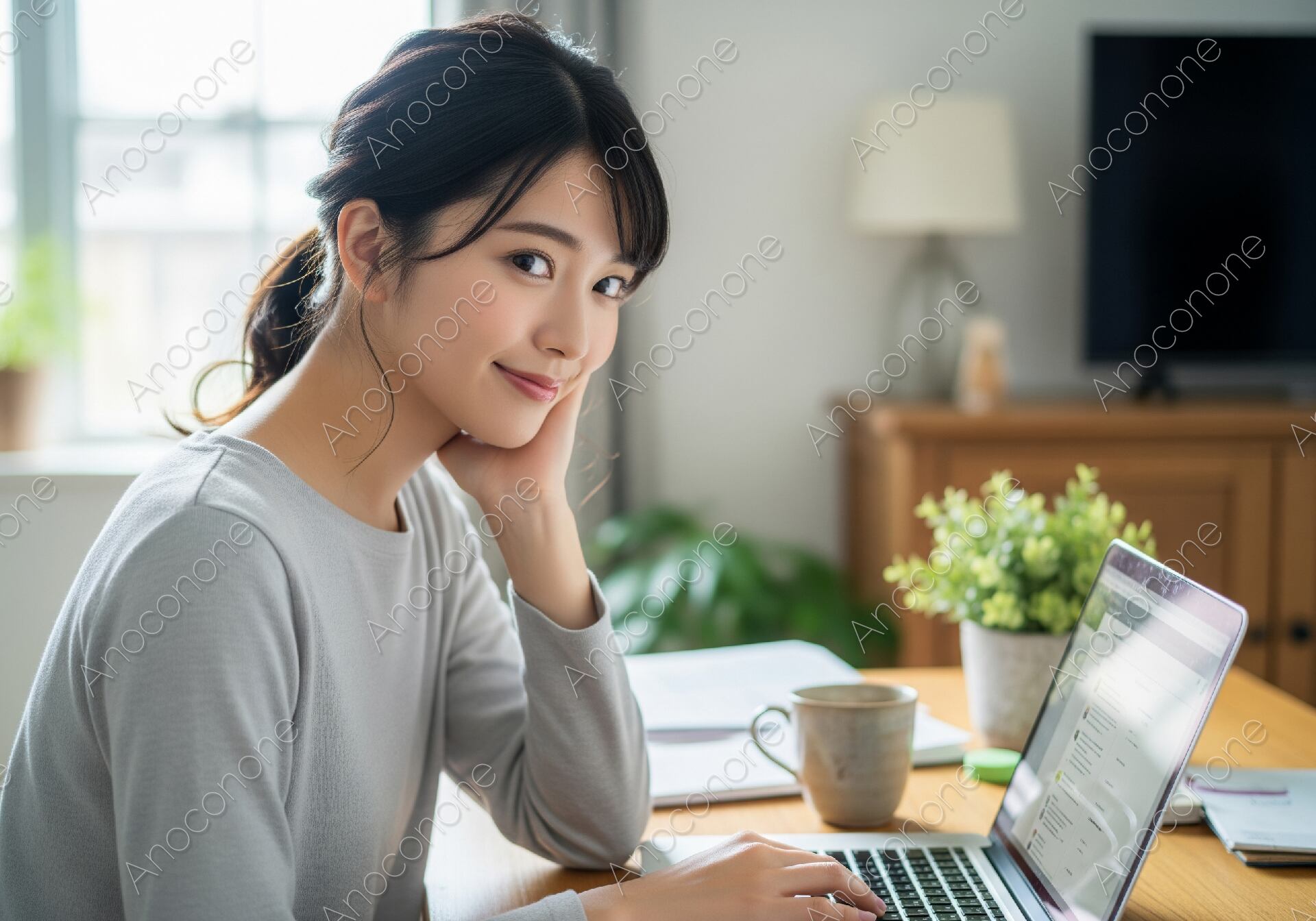 画像素材:自宅のワークスペースと思われる落ち着いた室内で、ノートパソコンを操作しながらこちらに優しい視線を向ける女性の姿を捉えています。女性はグレーのシンプルなカットソーを着用し、髪を後ろでまとめた清潔感のあるスタイルです。片手を顎に添えて微笑む表情からは、仕事や作業が順調に進んでいるような心の余裕が感じられます。デスクの上には飲み物が入ったマグカップや観葉植物が置かれ、背景にはテレビや棚などの家具が適度にぼかして配置されており、生活感の中にも整った美しさがある空間です。窓から差し込む柔らかな自然光が、女性の肌や髪の質感を健康的に引き立てており、全体として温かみのあるナチュラルな雰囲気に包まれています。リモートワークや在宅での趣味の時間など、自分らしい暮らしを楽しむ様子を表現するのに最適な一枚です。フリーランスやテレワークをテーマにした広告や、ライフスタイルを紹介するブログの素材として幅広く活用いただけます。