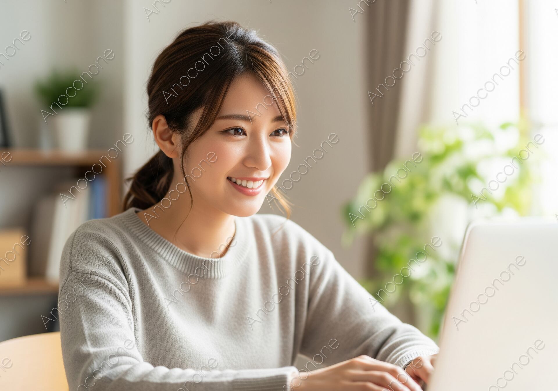 画像素材:自然光がたっぷりと差し込む明るい室内で、ノートパソコンの画面を見つめながら晴れやかな笑顔を見せる女性の姿を捉えた一枚です。女性はグレーの柔らかなニットを着用し、髪を後ろでラフにまとめた清潔感のあるスタイルで、リラックスした様子で作業に取り組んでいます。背景には生き生きとした観葉植物の緑や、木目調の家具が配置されており、温かみのあるナチュラルなインテリアが心地よい空間を演出しています。女性の表情からは仕事や趣味の時間が充実していることが伺え、見ている側にも前向きで明るい印象を与えます。肌の質感や髪の毛一本一本、キーボードを叩く手の動きまで細やかに描写されており、日常の何気ない瞬間を高いクオリティで切り取っています。在宅ワークやオンライン学習、自分らしい豊かなライフスタイルを提案するビジュアルに最適です。充実したおうち時間を過ごす層へ向けた広告素材として活用いただけます。