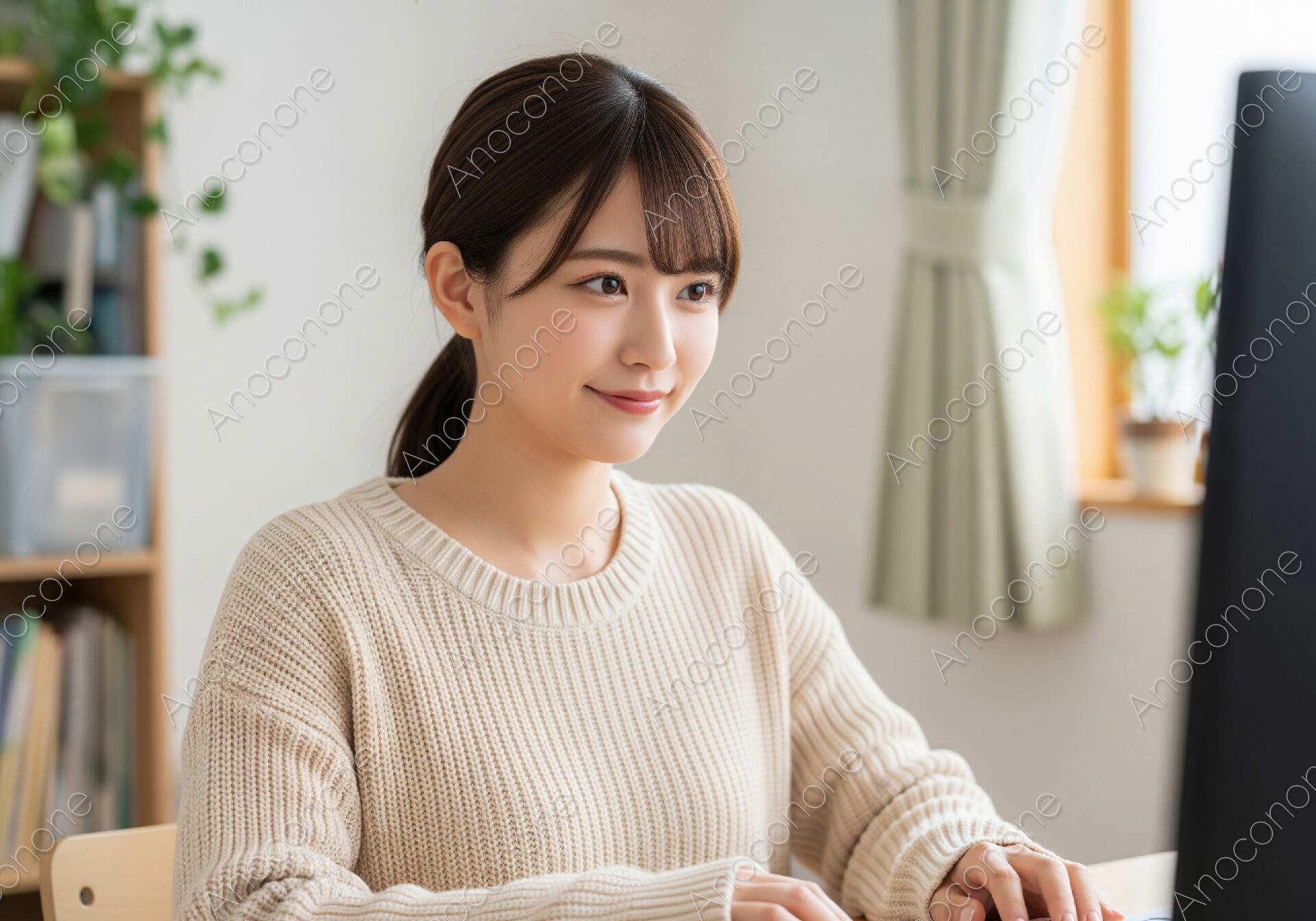画像素材:自宅やプライベートなワークスペースを思わせる温かみのある室内で、デスクトップパソコンに向かって作業を行う女性の姿を正面から捉えた一枚です。女性はベージュの柔らかなニットを着用しており、髪を後ろで一つにまとめた清潔感のあるスタイルです。画面を見つめる目元には穏やかな微笑みが浮かんでおり、リラックスした状態で物事に取り組んでいる様子が伝わります。背景には淡い色のカーテンや棚、そして生き生きとした観葉植物が配置されており、シンプルながらも整えられた居心地の良い空間が演出されています。窓から差し込む自然光が室内を明るく照らし、被写体の肌や衣服の質感を細やかに引き立てています。過度な装飾を排したナチュラルな構成は、見る人に安心感と誠実な印象を与えます。在宅ワークや個人の趣味、ライフスタイルの充実をテーマにしたブログや広告のビジュアルとして使い勝手の良い素材です。自分らしい働き方を大切にする方への訴求に最適です。