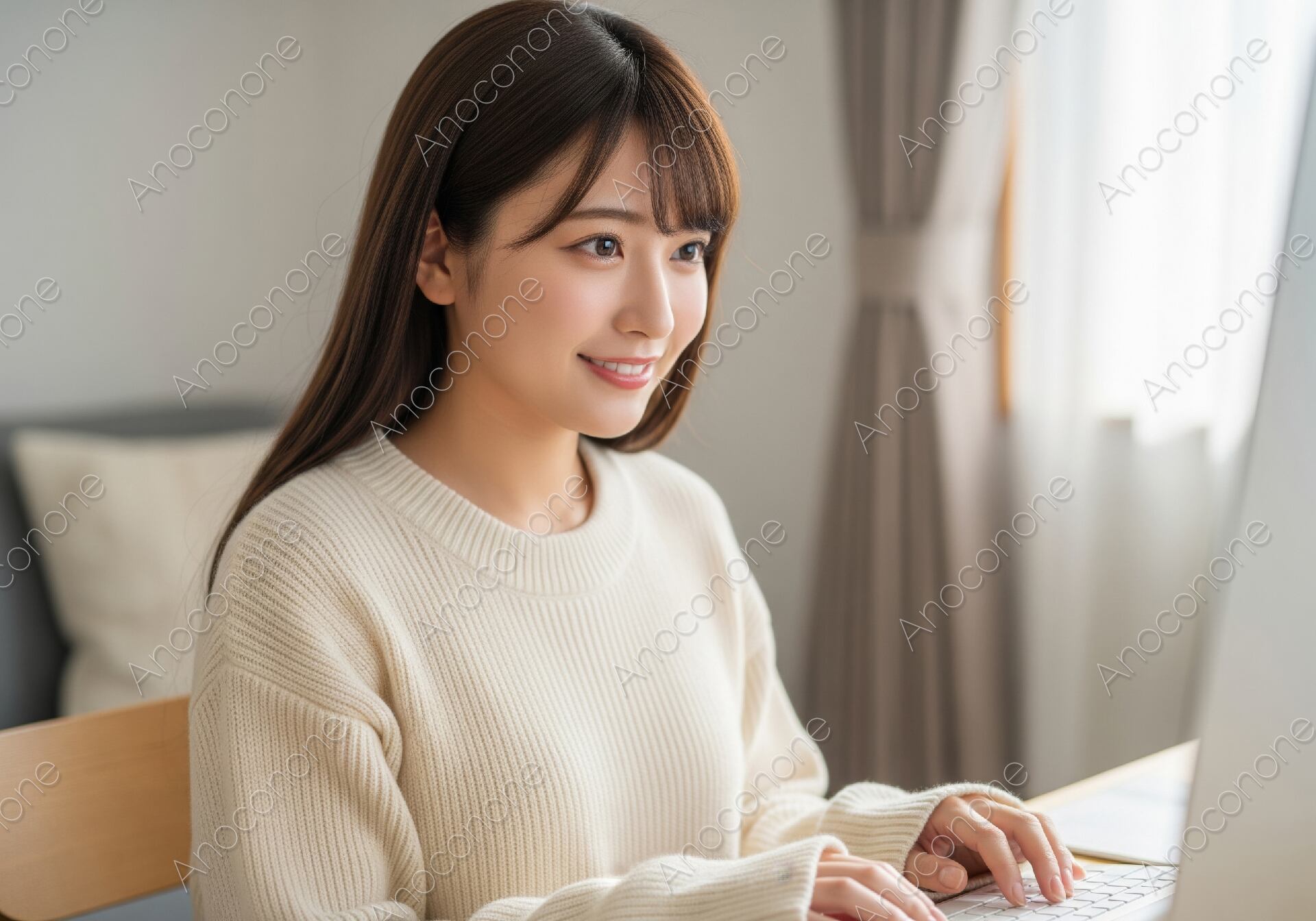画像素材:明るい日差しが差し込む清潔感のある室内で、パソコンの画面を眺めながら穏やかな微笑みを浮かべる女性の姿を捉えています。女性はアイボリーのシンプルなニットを着用しており、さらりとした長い髪がナチュラルで上品な印象を与えます。背景にはベージュのカーテンやクッションが配置され、暖かみのある色調で統一されたプライベートな空間が広がっています。画面に向かう女性の表情は生き生きとしており、自宅での仕事や趣味の時間が充実している様子が伝わってきます。肌の質感やニットの編み目、そして窓から入る光の加減まで繊細に描写されており、静かで心地よい空気感を表現した一枚です。無駄のない構図と柔らかなライティングは、見る人に安心感とポジティブなイメージを抱かせます。在宅ワークや自分らしいライフスタイル、オンライン学習などをテーマにしたウェブサイトのメインビジュアルに最適です。充実したおうち時間を大切にする層へ向けた広告素材として活用いただけます。