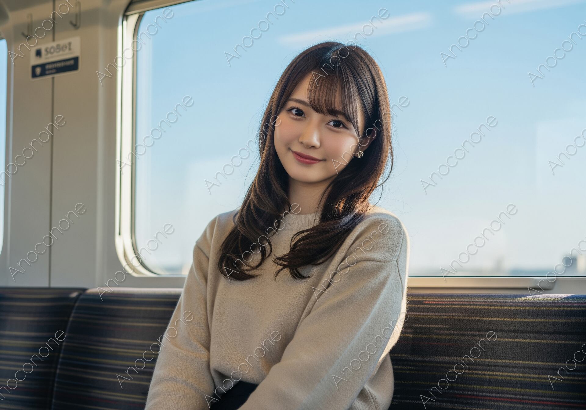 画像素材:明るい日差しが差し込む電車の座席に座り、穏やかな表情でこちらを見つめる女性のポートレートです。女性はベージュのシンプルなクルーネックニットを着用しており、清潔感のあるナチュラルな美しさが際立っています。窓の外には澄み渡った青空が広がり、車内に降り注ぐ自然光が女性の肌や髪を柔らかく照らし、健康的で明るい雰囲気を作り出しています。背景の座席や窓枠は適度にぼかされており、主役である人物の存在感をより印象深く引き立てる構図です。移動中のふとした瞬間の安らぎや、旅の途中の心地よい高揚感を感じさせるような、ストーリー性のあるビジュアルに仕上がっています。衣服の柔らかな質感や、丁寧に整えられた髪の毛一本一本までが高精細に描写されており、広告やウェブサイトのメインビジュアルとして非常に高い品質を誇ります。鉄道旅行のプロモーション、通勤・通学のライフスタイル紹介、あるいは冬のデイリーファッションの提案など、日常の中の特別な一コマを演出したい場面に最適な一枚です。