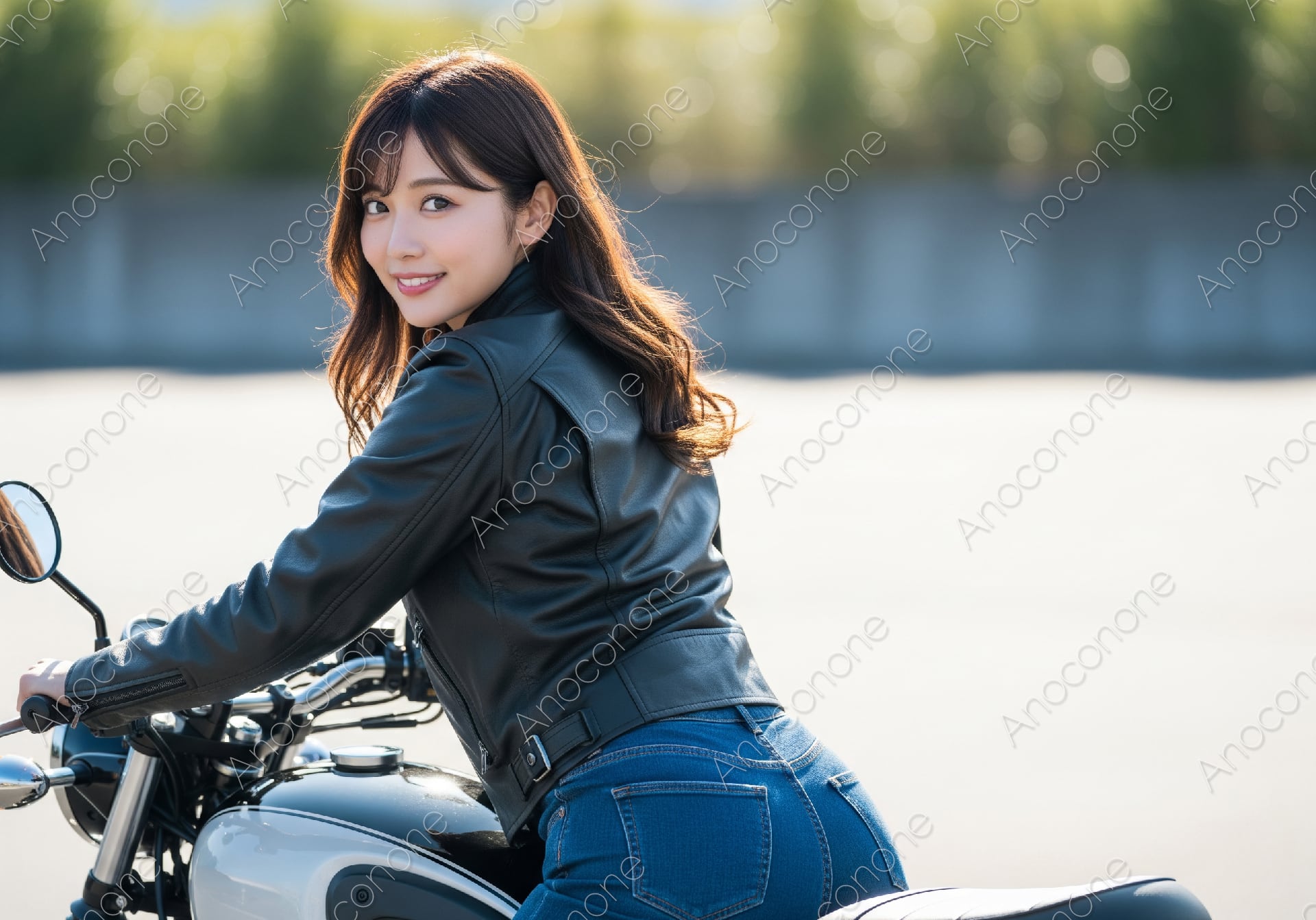 画像素材:明るい日差しが差し込む屋外で、クラシックなスタイルのバイクに跨る女性ライダーの姿を背後から捉えた、躍動感あふれる一枚です。女性は体にフィットした黒のレザージャケットとブルーのデニムパンツを着用しており、アクティブで洗練された大人のバイクスタイルを表現しています。バイクのシートに座り、肩越しにこちらを振り返る晴れやかな笑顔が印象的で、ツーリングの合間のリラックスした空気感が伝わってきます。背景は優しくぼかされており、主役である女性とバイクの金属的な質感を美しく際立たせています。レザージャケットの細かなシワや光沢、バイクのタンクに映り込む光、そして風になびく柔らかな髪の毛先まで、非常に高い解像度で描写されています。オートバイ関連の広告や雑誌、アクティブなライフスタイルを提案するウェブサイトのメインビジュアルに最適です。自由で前向きなエネルギーを感じさせる高品質な素材です。