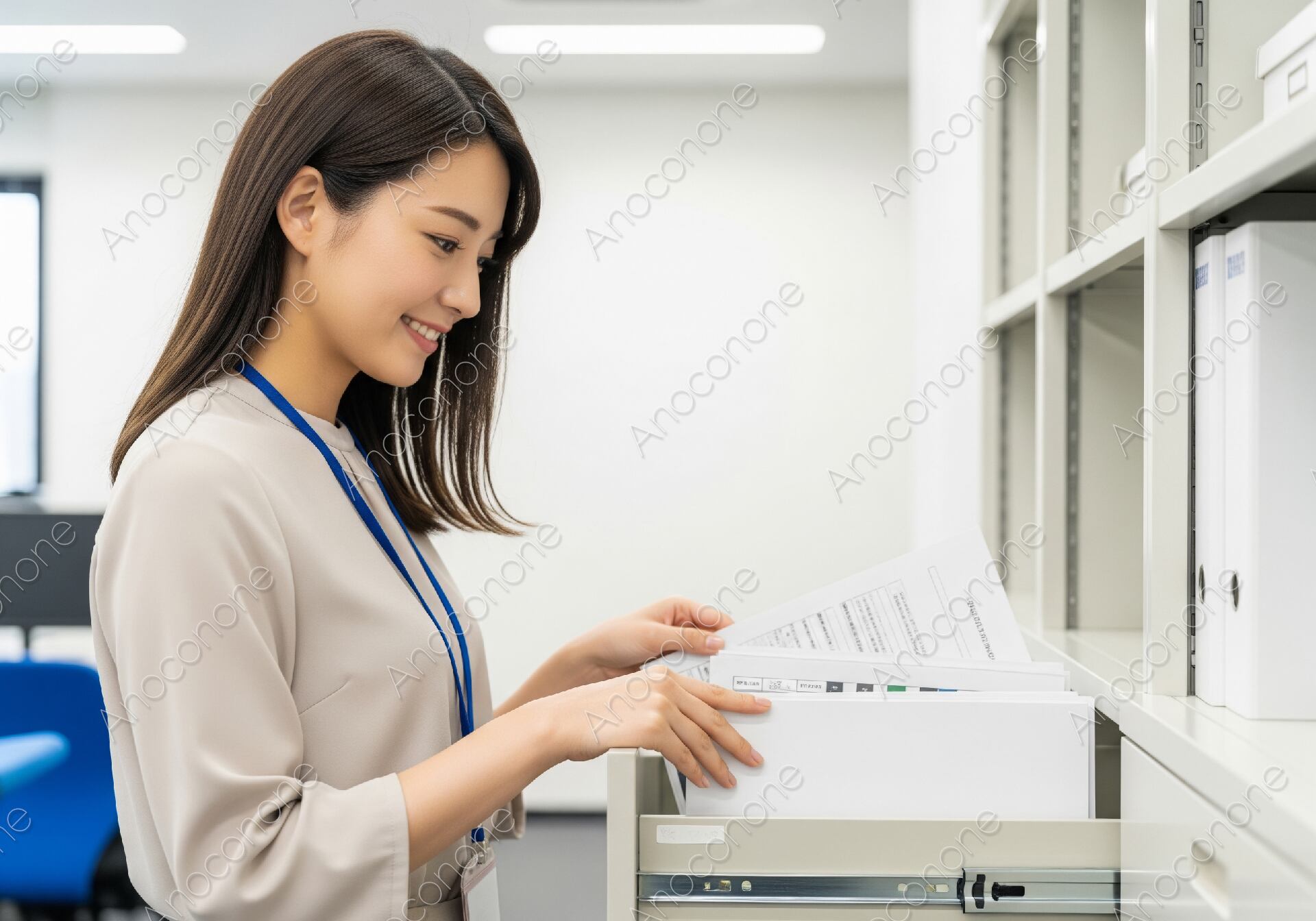 画像素材:明るく清潔感のあるオフィス環境で、ファイリングキャビネットから必要な書類を丁寧に取り出す女性ビジネスパーソンの姿を捉えた一枚です。女性は落ち着いたベージュのブラウスを身に纏い、首からはIDカードホルダーを下げており、現代的なオフィスでの日常的な業務シーンをリアルに表現しています。キャビネットの中を確認しながら浮かべる穏やかで自信に満ちた微笑みは、仕事への充実感とプロフェッショナルな姿勢を感じさせます。背景には整理整頓された棚やオフィス家具が配置され、効率的で心地よい職場環境を演出しています。窓からの柔らかな自然光と屋内の照明が調和し、被写体の肌のトーンや衣服の質感を美しく、かつナチュラルに引き立てています。ビジネス系ウェブサイトのメインビジュアル、求人広告、社内研修資料、働き方改革をテーマにした記事など、信頼性とポジティブなイメージを届けたいデザインに最適です。細部まで鮮明に描写された高品質な素材です。