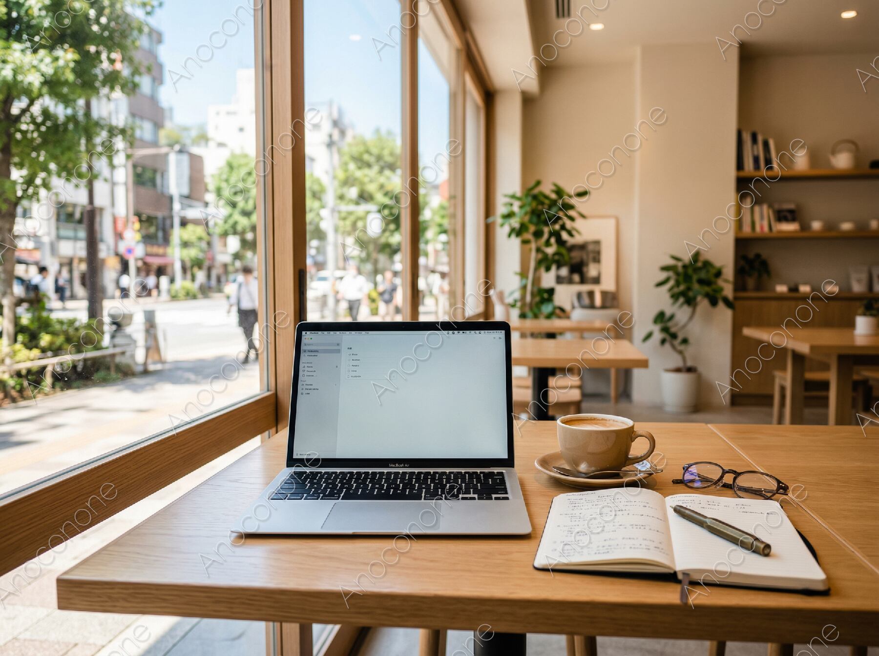 画像素材:広々としたカフェの窓際席で、ノートパソコンと手書きのノートを広げて作業をしている様子を捉えた写真です。デスクの上には、画面が開かれたパソコン、温かなカフェラテ、そして万年筆が添えられたノートと眼鏡が整然と置かれています。大きな窓からは、緑豊かな街路樹と青空が広がる都会の街並みが一望でき、非常に開放感のある空間が広がっています。店内はナチュラルな木製のテーブルや観葉植物が配置され、落ち着いたベージュトーンの壁面が穏やかな空気感を演出しています。自然光がテーブルを明るく照らし、クリエイティブな思考が進みそうな理想的なワークスペースが描写されています。外の風景と室内の静けさが調和した、奥行きのある構図が特徴的です。リモートワークやノマドスタイルを紹介するメディアに最適な素材です。