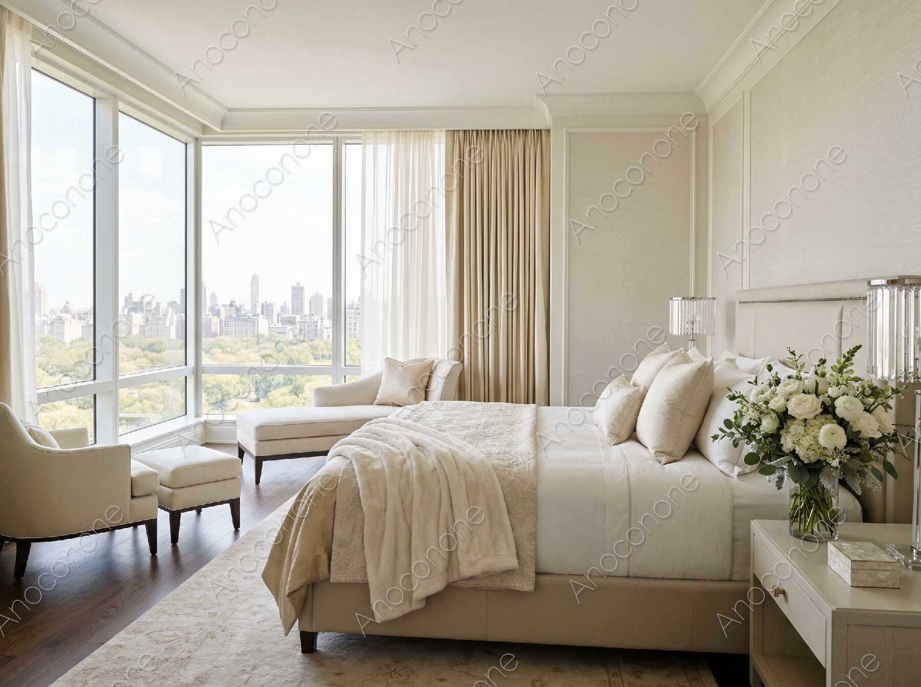 画像素材:大きなコーナーウィンドウから都会の街並みと豊かな緑を一望できる、最高級ホテルのスイートルームを捉えた写真です。室内はアイボリーやベージュの上品なトーンで統一され、質感の良いリネンが整えられたキングサイズのベッドが中央に配置されています。枕元には華やかな白いバラのブーケが飾られ、柔らかな自然光が室内を明るく包み込んでいます。窓際にはゆったりとしたカウチソファが置かれ、景色を眺めながら贅沢な時間を過ごせる空間が広がっています。洗練されたデザインの照明や調度品が、落ち着きのあるラグジュアリーな雰囲気を演出しており、細部にまで至福のホスピタリティが感じられます。静謐で開放感のある構成は、特別な日の宿泊や非日常の体験を象徴しています。ハイクラスな旅行プランやブライダル関連のプロモーションに最適な一枚です。